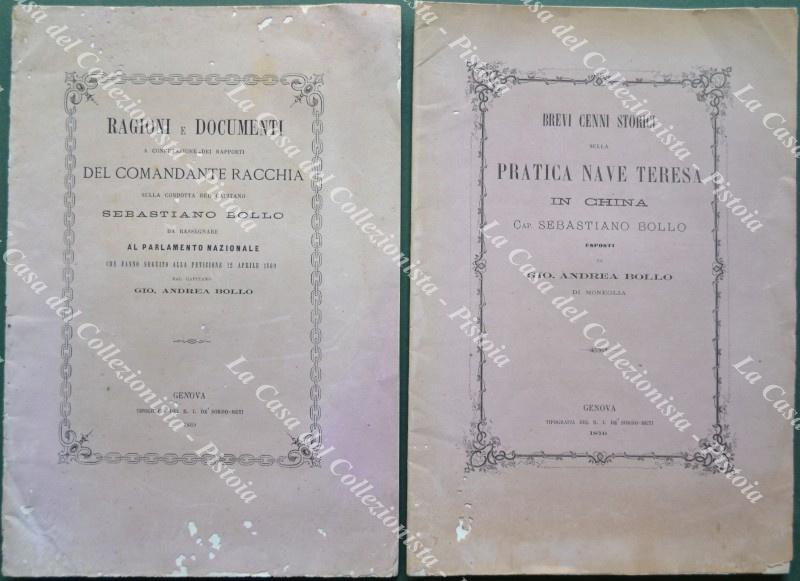 (Pirateria, Cina, Marina italiana) Due pubblicazioni relative alla rivolta dei coloni cinesi a bordo della nave Teresa in alto mare, del suo saccheggio da parte dei pirati nel porto di Chpò e del discutibile operato del console italiano: 1) Ragioni e documenti a confutazione dei rapporti del comandante Racchia sulla condotta del capitano Sebastiano Bollo. Genova, Tip. Sordomuti, 1869. Cm 18x26, brossura edit., pp. 22 + (2), lievi mende. 2) Brevi cenni storici sulla pratica nave Teresa in China. Cap. Sebastino Bollo. Esposti da Gio. Andrea Bollo di Moneglia. Genova, Tip. Sordomuti, 1870. Cm 18x26, brossura edit., pp. 17 + (1). Lievi mende. (Rif.F1764-293/75)