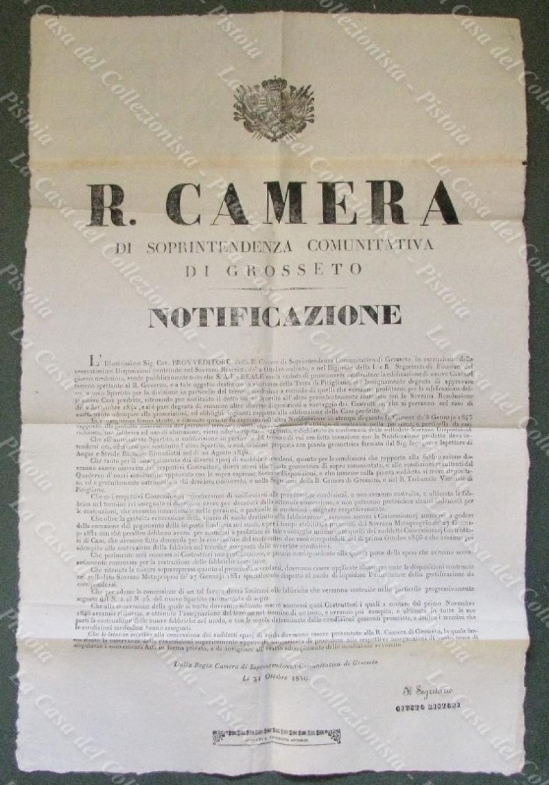 PITIGLIANO, GROSSETO. Bando del 1846di cm 42x65, relativo a concessioni e norme per la costuzione di case a Pitigliano. Buona conservazione. (Rif.E5795)
