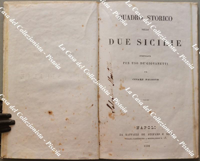 (Regno Due Sicilie) DALBONO CESARE. QUADRO STORICO DELLE DUE SICILIE. Compilato per uso di giovanetti. Napoli, Raffaele De Stefano e Soci, 1838 (prima edizione). Cm 12x19, legatura coeva in piena pergamena. Pp. 84, lievi usure. (Rif.F5673-76)