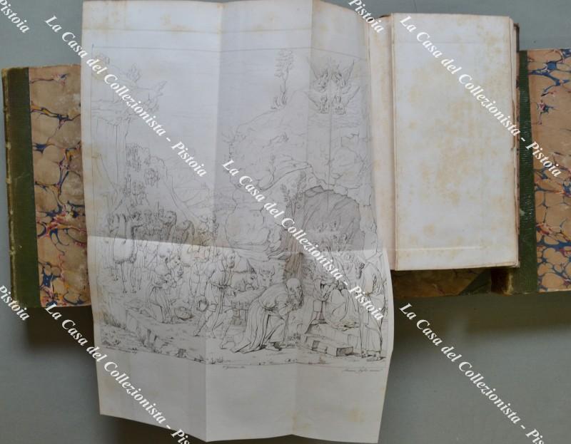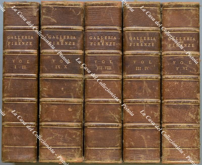 (Toscana, arte, figurato '800) REALE GALLERIA DI FIRENZE ILLUSTRATA. Firenze, Presso Molini e Co., 1817-1824. Cm 13x21, legatura coeva in mezza pelle con punte, piatti marmorizzati e al dorso nervi e tit. in oro. 5 tomi contenenti 10 volumi. I TOMO, QUADRI DI STORIA, volumi 1° e 2°, di pp. (10) + 192 e pp. (6) + 171 + 91 tavole fuori testo. Anno 1817. ** II TOMO. QUADRI DI VARIO GENERE. Pp. (4) + 132 + 42 tavole fuori testo, anno 1824 ** RITRATTI DI PITTORI. Vol. I. Pp. (6) + 276 + 58 tavole fuori testo. Anno 1817. ** III TOMO. RITRATTI DI PITTORI, columi II e III, pp. VIII + 200 e pp. (8) + 178 con 132 tavole fuori testo. Anni 1820/1821. ** IV TOMO. STATUE, BASSORILIEVI, BUSTI E BRONZI. Volumi I e II. Pp. (4) + 203 e pp. (4) + 264 con 103 tavole fuori testo. (manca la n. 67). Anni 1717 e 1819. ** V TOMO. STATUE, BASSORILEIVI, BUSTI E BRONZI. Volume III. Pp. (4) + 267 con 54 tavole fuori testo. Anno 1824 ** CAMMEI E INTAGLI. Pp. (14) + 302 con 36 tavole fuori testo. Anno 1824. Oltre 500 tavole incise da G.P. Lasinio. Volumi solidi, qualche piccola usura alle legature, interni buoni eccetto ingiallimenti ed uno strappo ricomposto ad una tavola. (Rif.F6612-76)