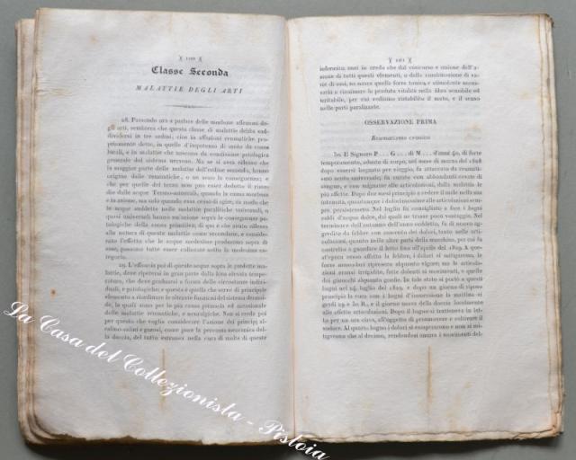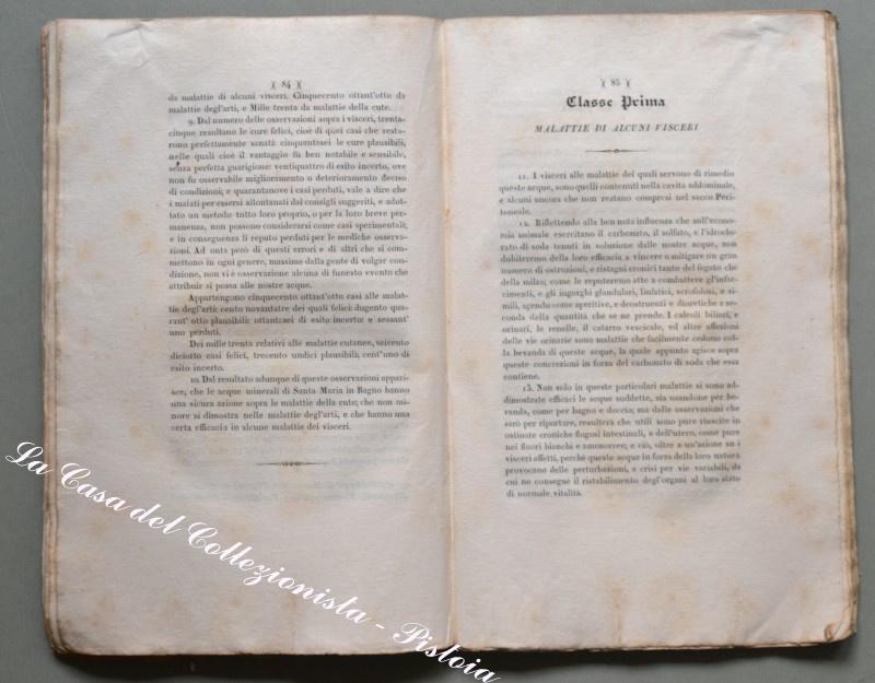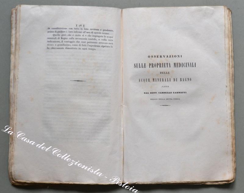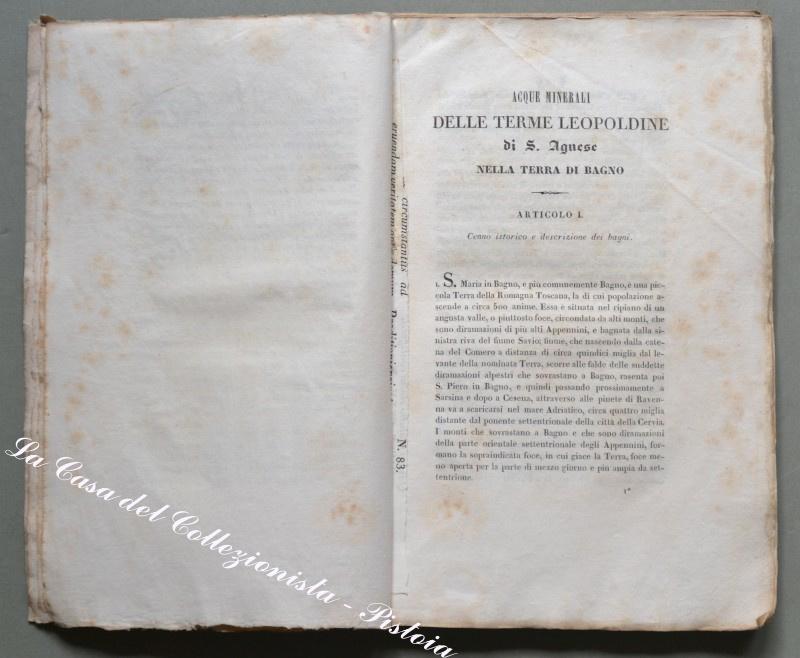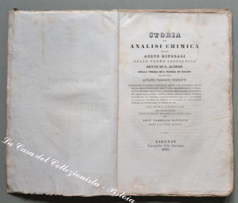 (Romagna – acque termali) TARGIONI TOZZETTI ANTONIO. STORIA ED ANALISI CHIMICA DELLE ACQUE MINERALI DELLE TERME LEOPOLDINE DETTE DI S. AGNESE NELLA TERRA DI S. MARIA IN BAGNO. Seconda edizione con osservazioni sulle proprietà medicinali di dette acque del Dott. Camillo Zannetti medico alle terme medesime. Firenze, Tip. della Speranza, 1839. In 8°, brossura originale (dorso restaurato e piatto posteriore un po’ sporco con piccola lacuna marginale restaurata), pagine 143. Esemplare in barbe, alcune pagine intonse, interno ben conservato eccetto qualche ingiallimento. (Rif.D3217 - 286/66)