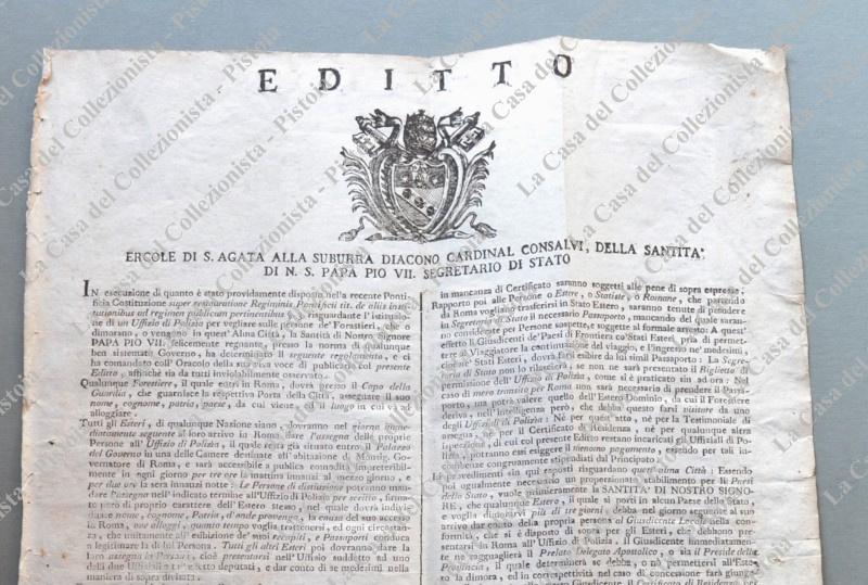 (Stato Pontificio – Pubblica sicurezza) EDITTO dato in Roma nel 1801 riguardante …“l’istituzione di un Ufficio di Polizia per vegliare sulle persone de’ Forastieri ...