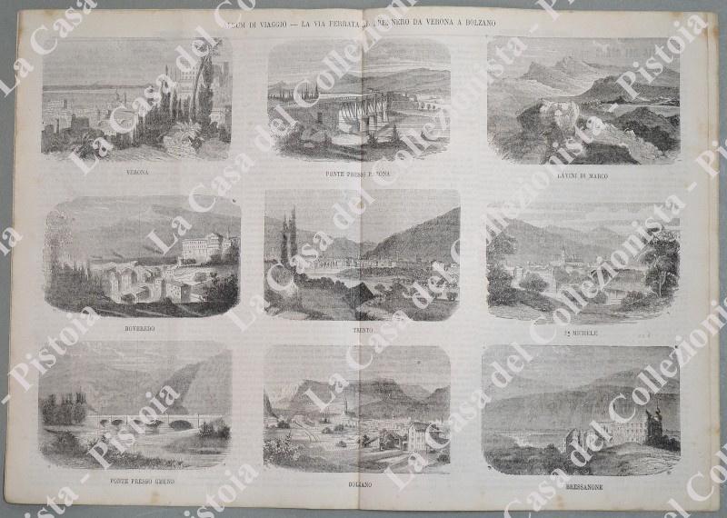 STRADA FERRATA DA VERONA A BOLZANO. Fascicolo numero 38 del 1865 de L'EMPORIO PITTORESCO. Formato cm 21x29,5. Completo. All'interno, su doppia pagina, nove vedute. (Rif.D6101)