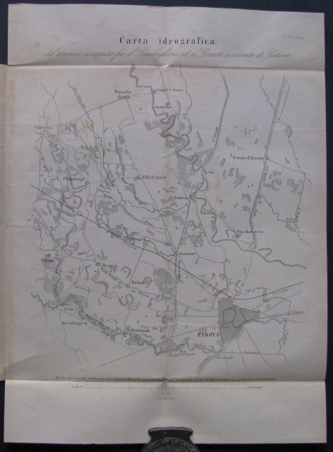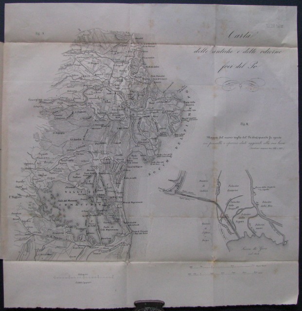 (Fiume Po) "Studi idrologici e storici sopra il grande estuario adriatico, i fiumi che vi confluiscono e principalmente gli ultimi tronchi del Po". Memoria dell'Ing. Elia Lombardini (stralcio di pp. complessive 180) tratta dal Giornale dell'Ingegnere Architetto del 1868. A corredo, fuori testo e più volte ripiegate: I°) "Carta idrografica dell'Italia settentrionale" di mm 500x360. II°) "Carta delle antiche e odierne foci del Po" di mm 340x340. III°) "Carta idrografica del territorio compreso fra il Bacchiglione ed il Brenta a monte di Padova" di mm 250x330.(Rif.A8140-484/47)