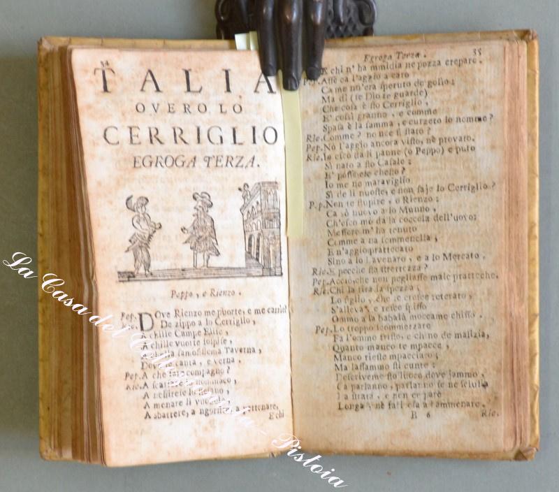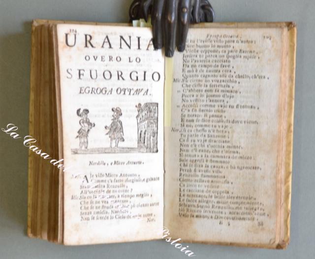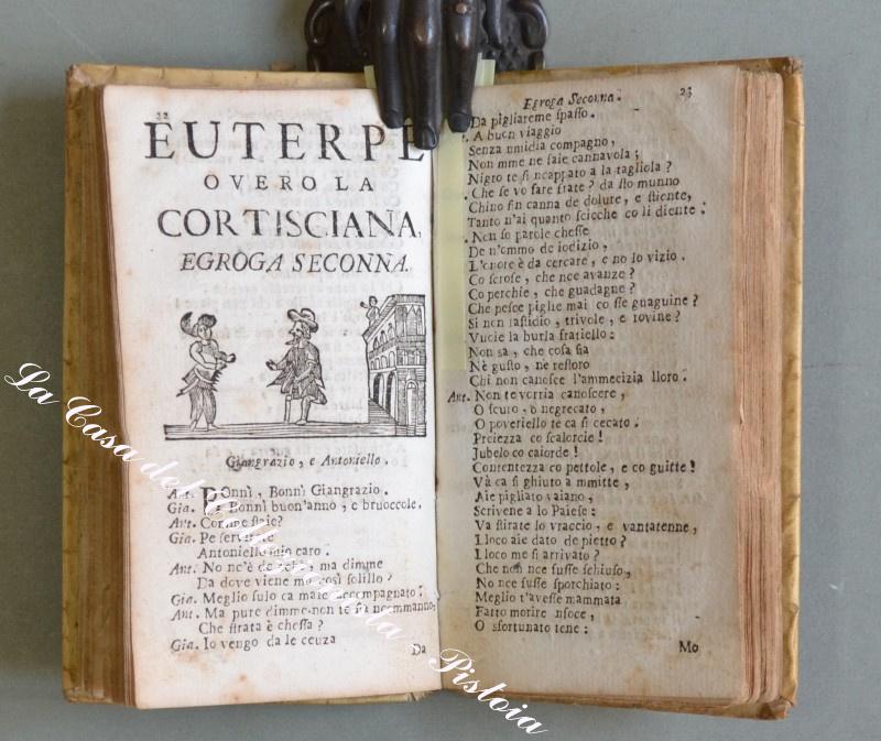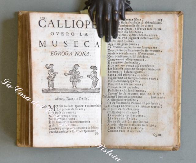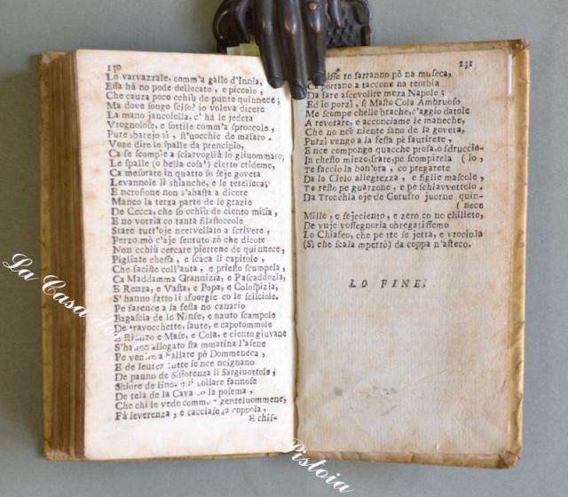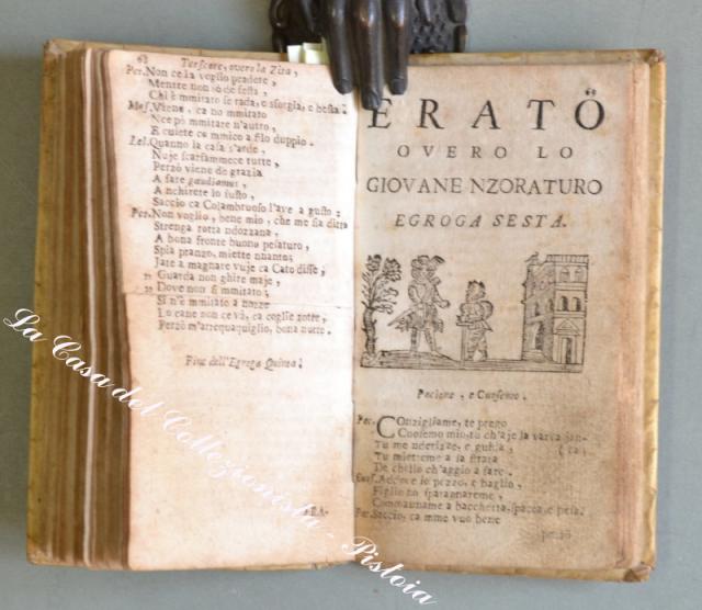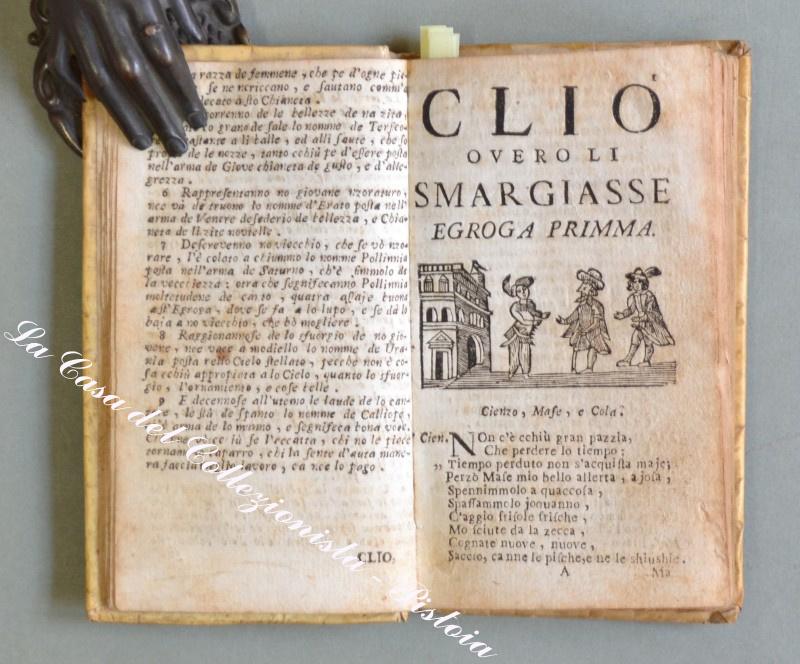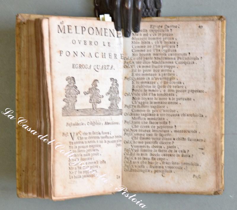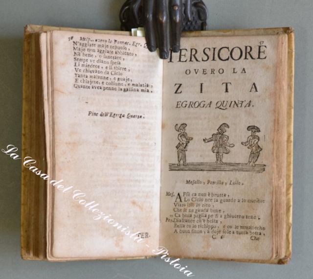 llostrissimo Segnore D. GIOVANNE COLUMBO. A Nnapole, pe Dommineco Langiano e Dommineco Vivenzio Compagna, 1745. In 16° (cm 14,8x8,5), pergamena coeva, pp. (12) + 131. Ciascuna egloga ha una vignetta all’inizio (in totale 9 xilografie raffiguranti gli interlocutori). Alla fine è aggiunta per la prima volta una lettera in versi. lo muto llustrissimo e magnifequo…. Messer Uneco ….”. Attribuita a Giulio Cesare Cortese scrittore e poeta napoletano. Questi nove dialoghi in versi con intento satirico tratteggiano altrettanti quadri di vita napoletana. Rarissima edizione popolare dedicata a Giovanni Columbo. Esemplare un pò rifilato in alto, leggeri ma diffusi ingiallimenti dovuti al tipo di carta, piccole imperfezioni alla pergamena. (Rif.D3595 - 605/67)