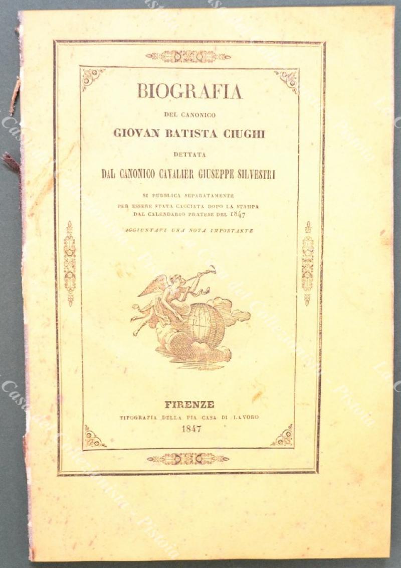 Toscana - Prato. SILVESTRI GIUSEPPE. BIOGRAFIA SUL CANONICO GIOVAN BATTISTA CIUGHI DI PRATO. Firenze, Tip. Pia Casa, 1847. Cm 14x20,5, brossura originale, pagine 30. Menda al dorso provenendo da miscellanea. (Rif.F3149)