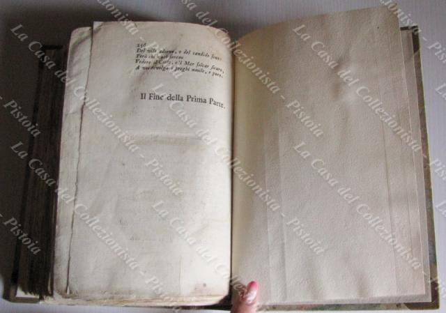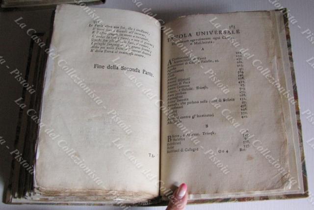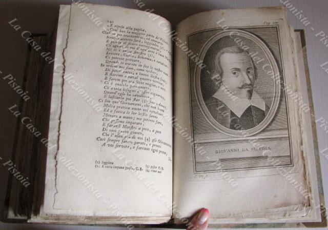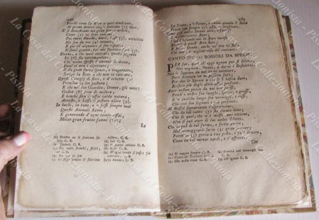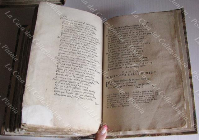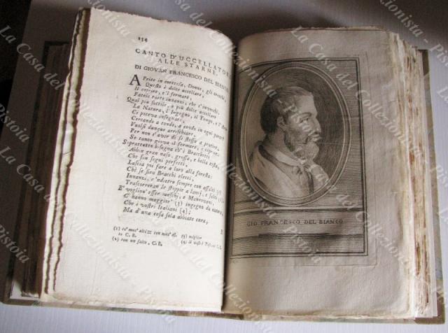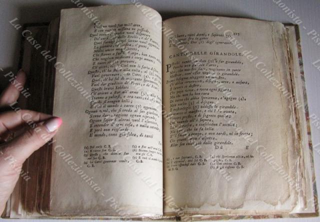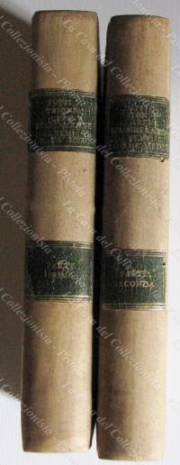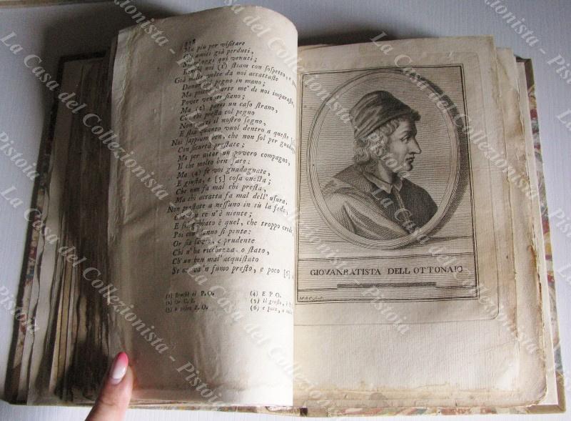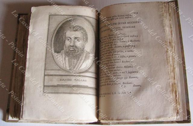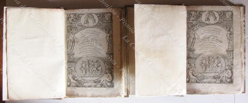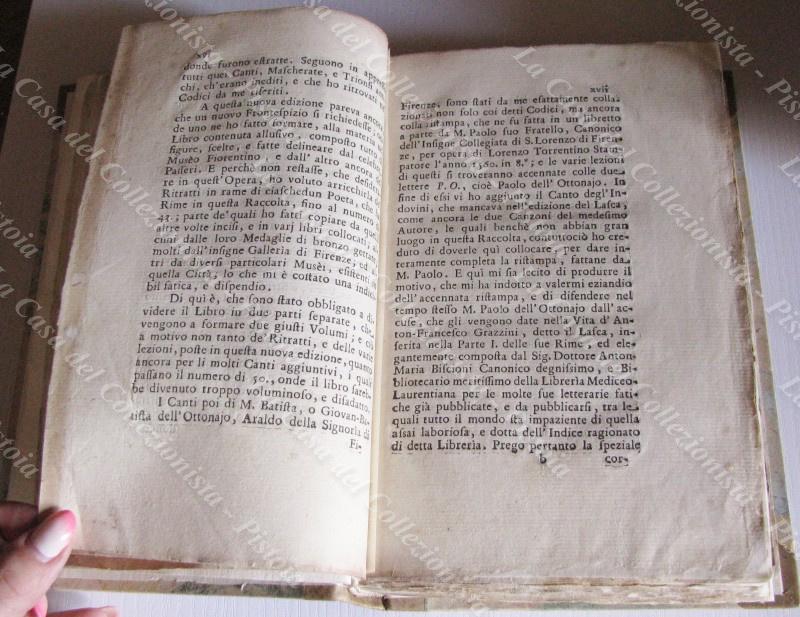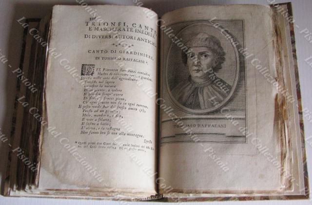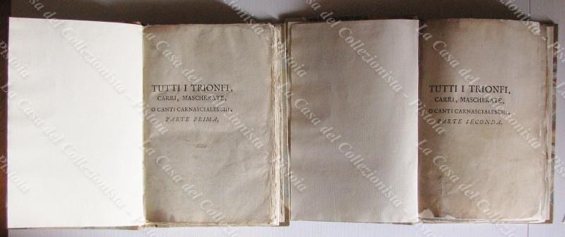 (Toscana – letteratura, medicea, musica, teatro, politica) GRAZZINI ANTONFRANCESCO (detto il Lasca) – NERI DEL BOCCIA (pseudonimo di Bracci Rinaldo Maria). TUTTI I TRIONFI CARRI, MASCHERATE O CANTI CARNACIALESCHI andati per Firenze dal tempo del Magnifico LORENZO DE’ MEDICI fino all’Anno 1559. In questa seconda Edizione corretti, con diversi MSS. collazionati, delle loro varie lezioni arricchiti, notabilmente accresciuti, E co’ ritratti di ciascun poeta adornati. In Cosmopoli (ma Lucca, Filippo Maria Benedini), 1750. In 8° (cm 14x21,5), legatura novecentesca in mezza pelle con punte, piatti marmorizzati e due tasselli ai dorsi. Due volumi, ciascuno con proprio frontespizio calcografico con figure mitologiche di pp. (2) + LX + 256 e pp. (4) + 259-594 + (2 bianche) con fuori testo 38 ritratti (su 44) di illustri fiorentini. Esemplare in barbe con restauri professionali alle punte e ai margini di molte pagine e qualche lieve brunitura. (Rif.D9577-411/73)