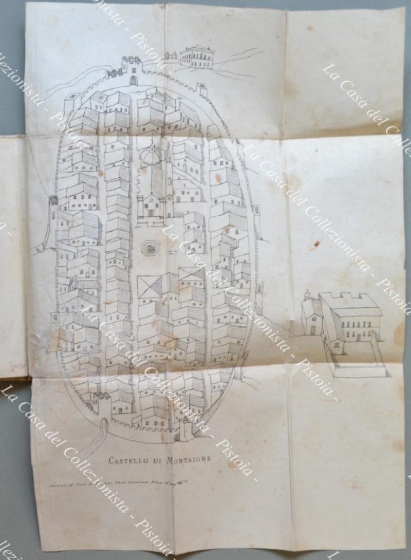 (Toscana – Montaione) ANGELELLI ANTONIO. MEMORIE STORICHE DI MONTAIONE IN VAL D’ELSA SEGUITE DAGLI STATUTI DI DETTO COMUNE. Firenze, Tip. Bencini, 1875. In 8° (cm 13,7x21,3), mezza pergamena recente (realizzata con materiale dell’epoca) e piatti marmorizzati. Pp. VIII + CCL + 75 + (3) ed alla fine grande tavola ripiegata fuori testo. Conservato il piatto anteriore (un poco macchiato) della brossura originale, mancano le pp. I/VI all’inizio, la tavola è stata restaurata. (Rif.D5051-469/69)