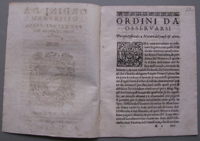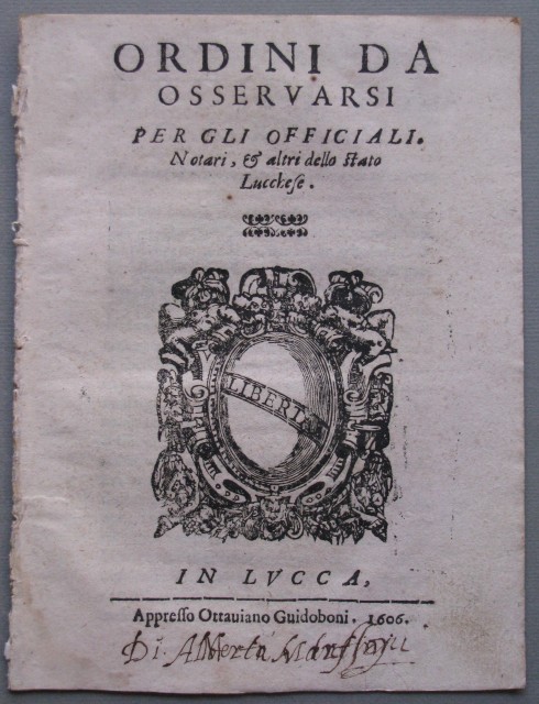 (Toscana '600 - Lucca) Ordini da osservarsi per gli officiali. Notari et altri dello Stato Lucchese. Lucca, presso Ottaviano Guidoboni, 1606. In 8'° (cm 15x20). Placchetta di 18 pagine. Due annotazioni coeve ai margini bianchi ed una antica firma d'appartenenza alla base del frontespizio. Ottima conservazione. (Rif.C769-468/64)