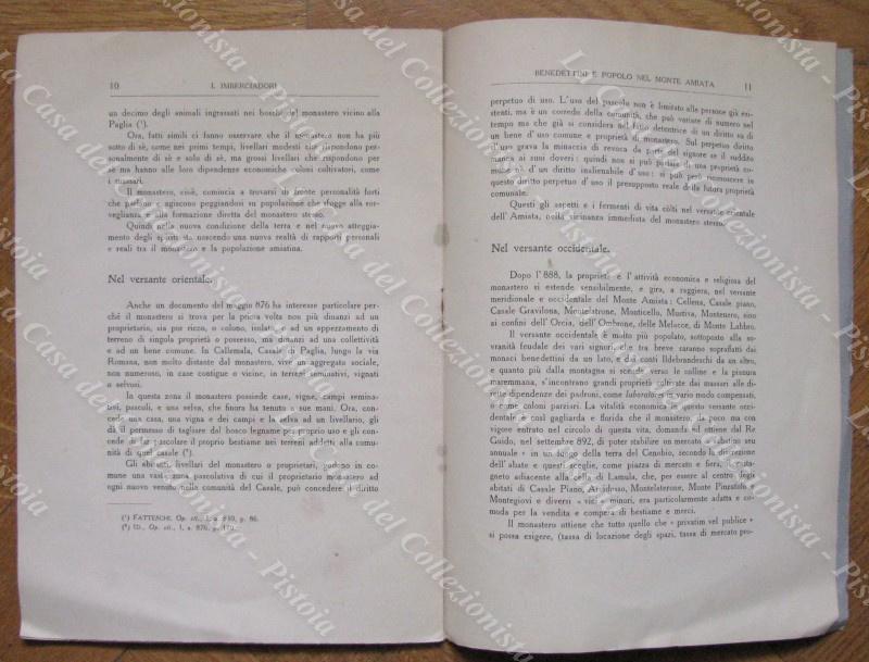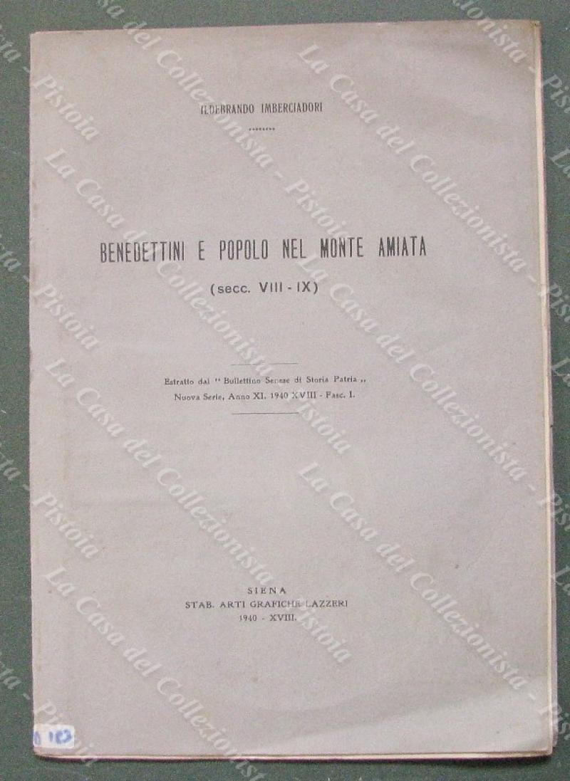 Toscana-Amiata. IMBERCIADORI ILDEBRANDO. BENEDETTINI E POPOLO NEL MONTE AMIATA. Estratto da Bollettino Senese anno 1940. Siena, Lazzari, 1940