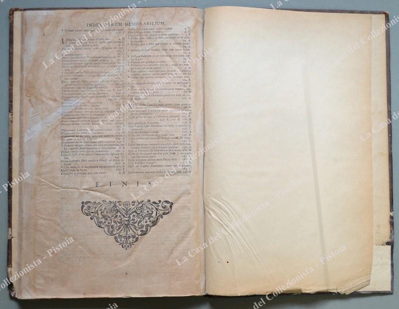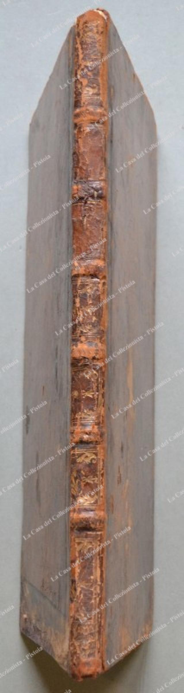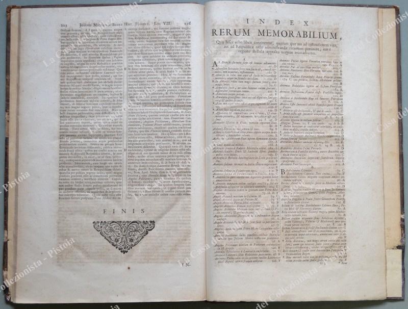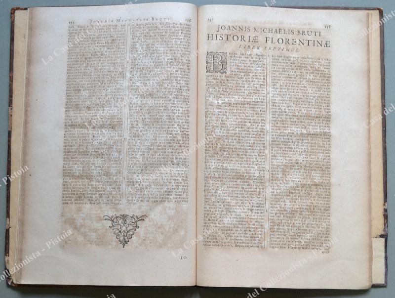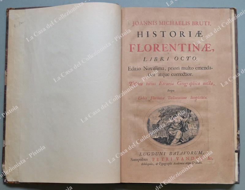 (Toscana) BRUTO GIOVANNI MICHELE. HISTORIAE FLORENTINAE. Libri octo. Editio Novissima, priori multo emendata atque correctior. Lugduni Batavorum (Leida), Peter Vander Aa, 1723. In folio (cm 22,5x38,5), piena pelle settecentesca con nervi al dorso, pp. (14) + pp. (108) con 216 colonne + pp. (10) di indice. Danni senza perdita di testo all’ultima carta, qualche usura alla legatura e brunitura diffusa alla carta delle pagine. Mancano le 2 tavole fuori testo. Quest’opera era parte del Thesaurus Antiquitatum e Historiarum Italiae di Giovanni Grevio. (Rif.D5085 - 458/69)
