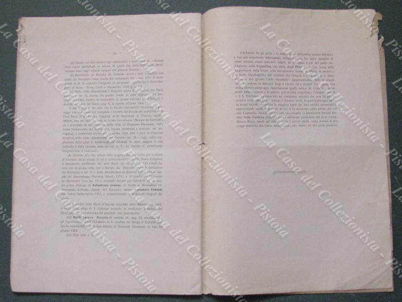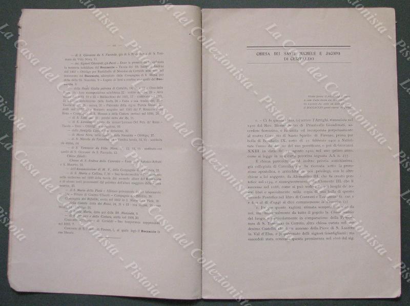 Toscana-Certaldo. ARRIGHI ANDREA. "LA CHIESA DEI SANTI MICHEL E JACOPO DI CERTALDO E SUE FILIALI. Notizie dettate nel 1692 DAL P. ANDREA ARRIGHI DETTO IL CAPRANICA edite da DOMENICO TORDI nel vi centenario della nascita del principemdella prosa italiana GIOVANNI BOCCACCIO". Orvieto, Tip. Maglione, 1913. Cm 19x28, brossura originale, pagine 35+(1). Rosicchiature, senza perdita di testo, all'angolo superiore delle ultime pagine. (Rif.E5247)