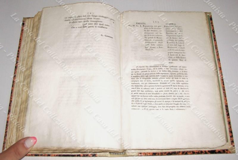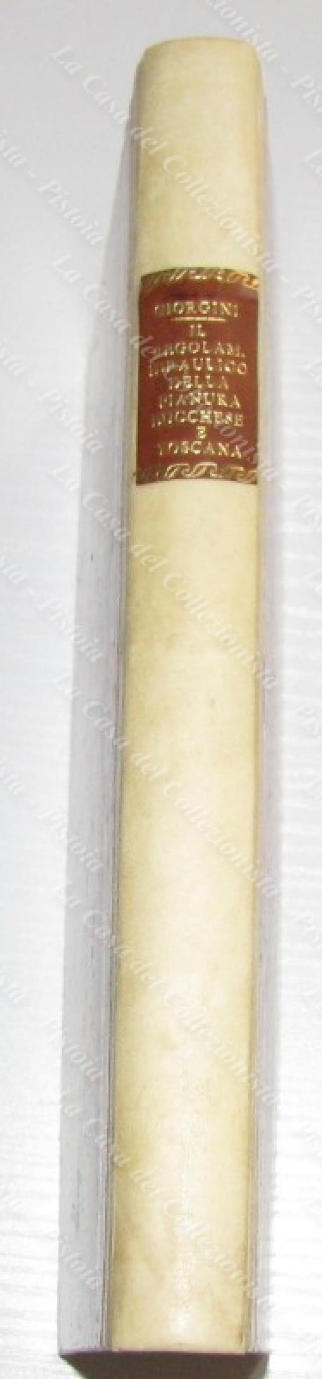 (Toscana, Lucca, Pisa – fiumi Arno e Serchio) GIORGINI GAETANO. RAGIONAMENTO SOPRA IL REGOLAMENTO IDRAULICO DELLA PIANURA LUCCHESE E TOSCANA INTERPOSTA FRA L’ARNO ED IL SERCHIO. Pisa, Pieraccini, 1839. In 8° (cm 15,5x24), mezza pergamena con tassello al dorso e piatti marmorizzati. Pp. 194 con alla fine, fuori testo, due carte più volte ripieg. (cm 52x62). Esemplare in barbe, completo e ben conservato ad eccezione di alcune macchie d’umidità alle carte geografiche finali (quest’ultime sono state montate su tela). (Rif.D9593-389/73)