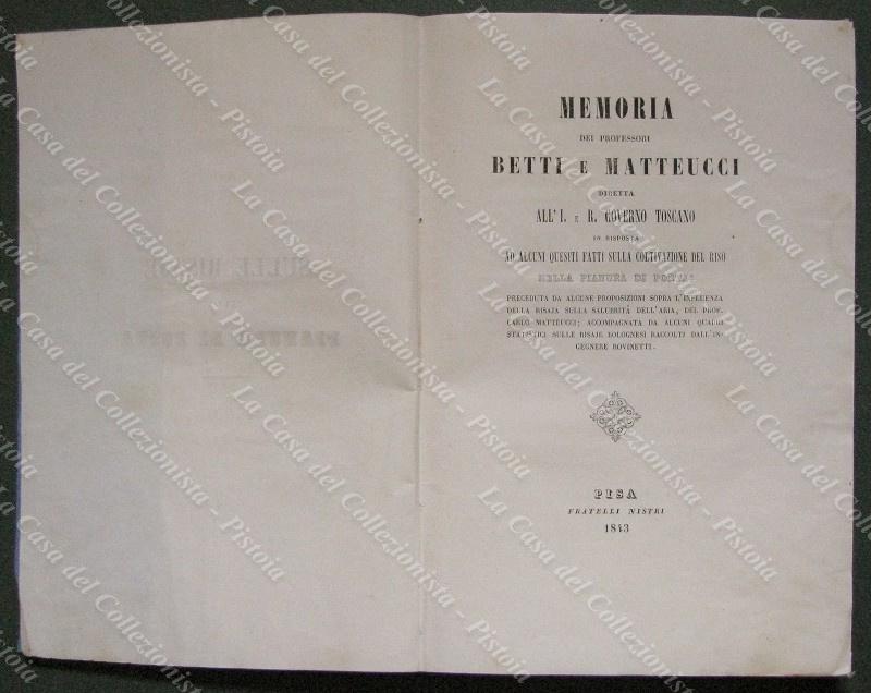 Toscana, Pisa-risaie. BETTI-MATTEUCCI. MEMORIA DIRETTA ALL'I.R. GOVERNO TOSCANO IN RISPOSTA AD ALCUNI QUESITI FATTI SULLA COLTIVAZIONE DEL RISO NELLA PIANURA DI PORTA. Pisa, Nistri, 1843. Cm 15x22, brossura tipografica originale, pagine 62. Ottima conservazione. (Rif.E5947)