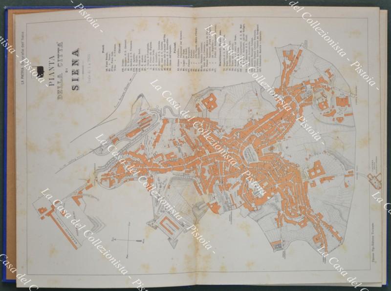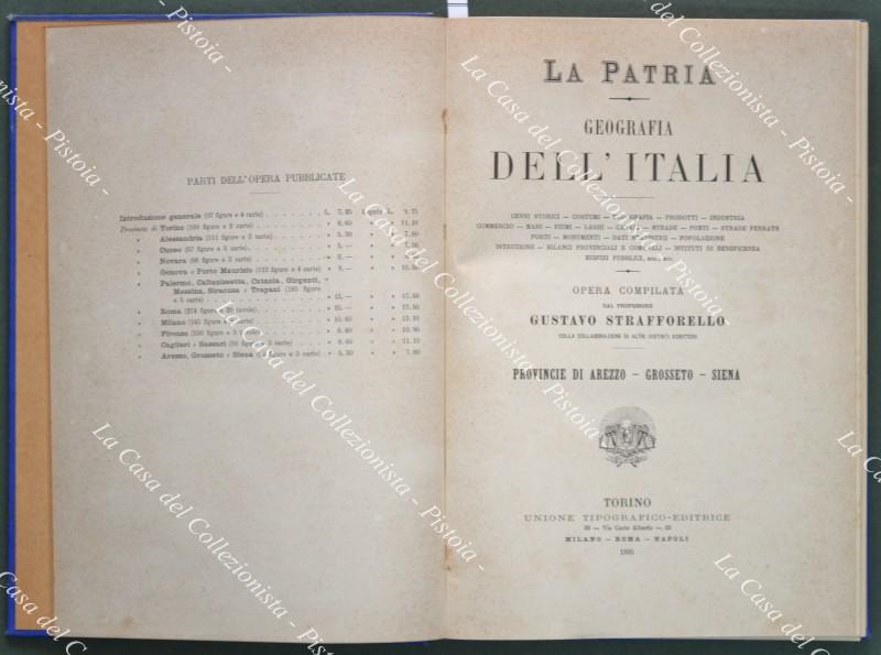 Toscana. Strafforello Gustavo. La Patria. Provincia di Arezzo, Grosseto, Siena. Torino, U.T.E.T., 1895. In 8° (cm 18x26), bella legatura editoriale in tela azzurra con impressioni in oro. Pagine 242 con 80 figure xilografiche nel testo e 3 carte fuori testo. E' presente la pianta della città di Siena, mancano la pianta di Arezzo e quella delle tre province. Legatura solida e ben conservata, interno buono con qualche ingiallimento alle pagine. (Rif.D9482)