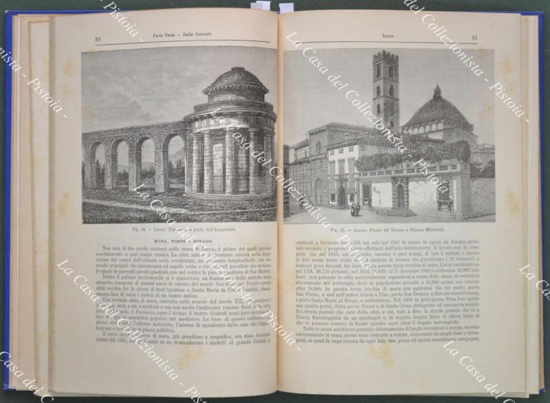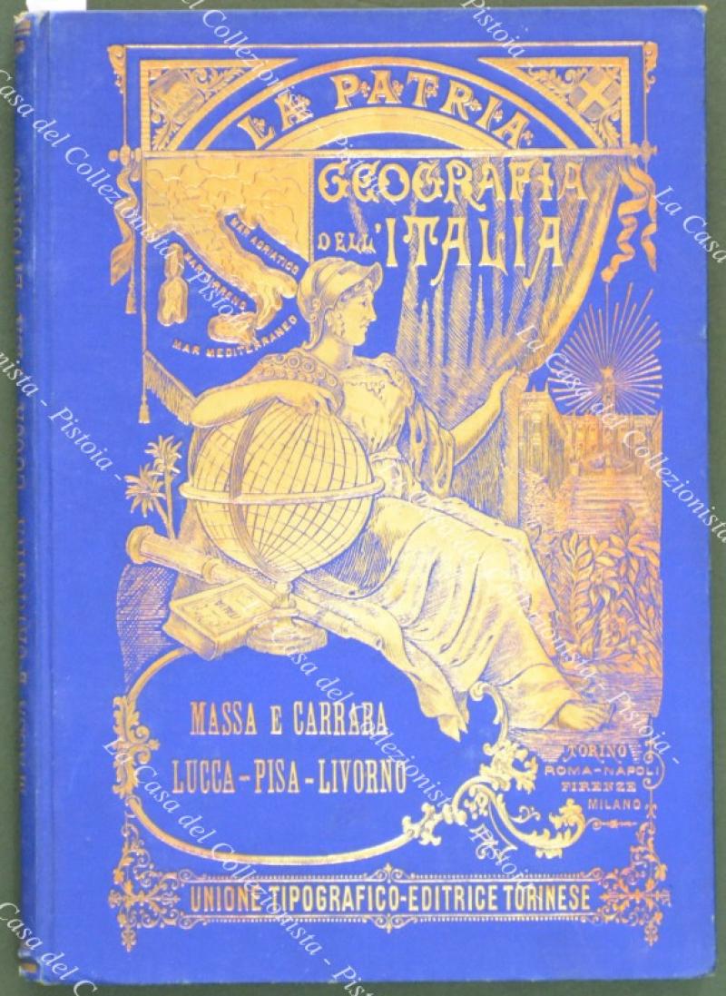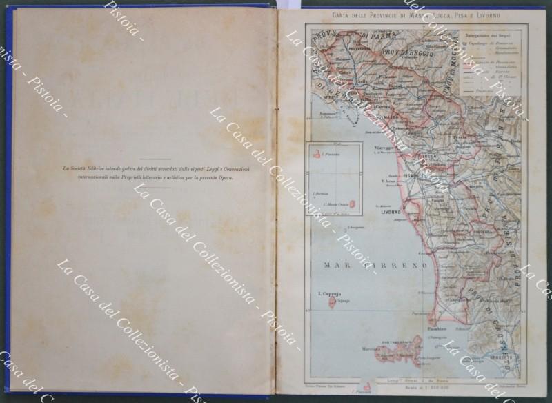 TOSCANA. Strafforello Gustavo. Province di Massa e Carrara, Lucca, Pisa, Livorno. Torino, U.T.E.T., 1896. In 8° (cm 18x26), bella legatura editoriale in tela azzurra con impressioni in oro. Pagine 272 con 104 figure in xilografia nel testo e 3 carte fuori testo (carta della provincia di Massa, Lucca, Pisa, Livorno - pianta di Massa - Pianta dei cantieri navali Orlando a Livorno). Legatura ben conservata, volume solido, interno ben conservato eccetto ingiallimenti a parte delle pagine. Opera completa. (Rif.D9450)