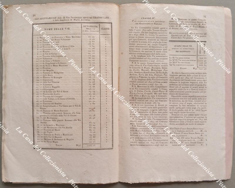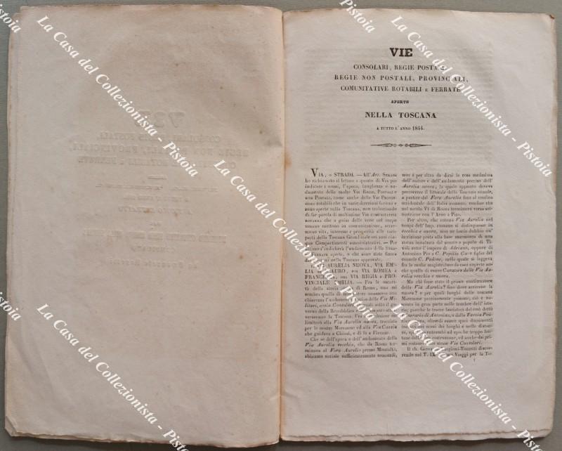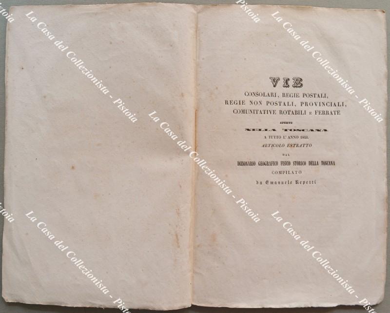 (Toscana) VIE CONSOLARI, REGIE POSTALI, REGIE NON POSTALI, PROVINCIALI, COMUNITATIVE ROTABILI e FERRATE aperte NELLA TOSCANA A TUTTO L’ANNO 1844. ARTICOLO ESTRATTO dal DIZIONARIO GEOGRAFICO FISICO STORICO DELLA TOSCANA compilato da Emanuele Repetti.