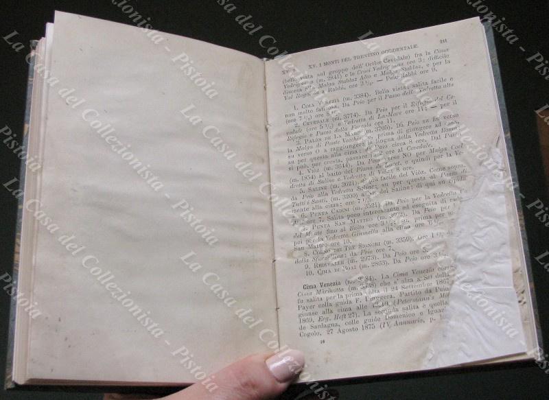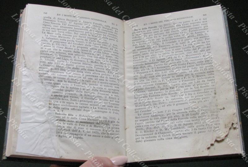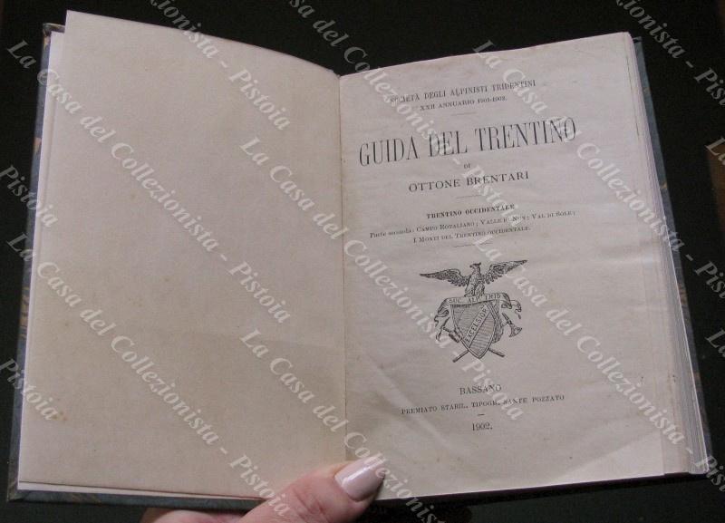 Trentino. BRENTARI OTTONE. GUIDA DEL TRENTINO Trentino occidentale. Parte seconda: Campo Rotaliano, Valle di Non, Val di Sole, I Monti del Trentino Occidentale. Bassano, Tip. Pozzato, 1902. Cm 11x16, legatura recente in mezza tela. Pagine VIII +298 con 13 tavole fuori testo fotografiche. legatura solida e ben conservata, esemplare completo, ma con difetti: qualche ingiallimento, danni alle ultime pagine (in particolare mancanza pagina 241-244). (Rif.E5245)