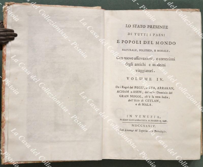 (Viaggi - illustrato ‘700) SALMON THOMAS. LO STATO PRESENTE DI TUTTI I PAESI E POPOLI DEL MONDO NATURALE, POLITICO, E MORALE. Con nuove osservazioni, e correzioni degli antichi e moderni viaggiatori. VOLUME IV. De i Regni del PEGU’, o VAA, ARRAKAN, ACHAM o ASEM; del vasto Dominio del GRAN MOGOL, ch’è la vera India; dell’Isole di CEYLAN, e di MALA.