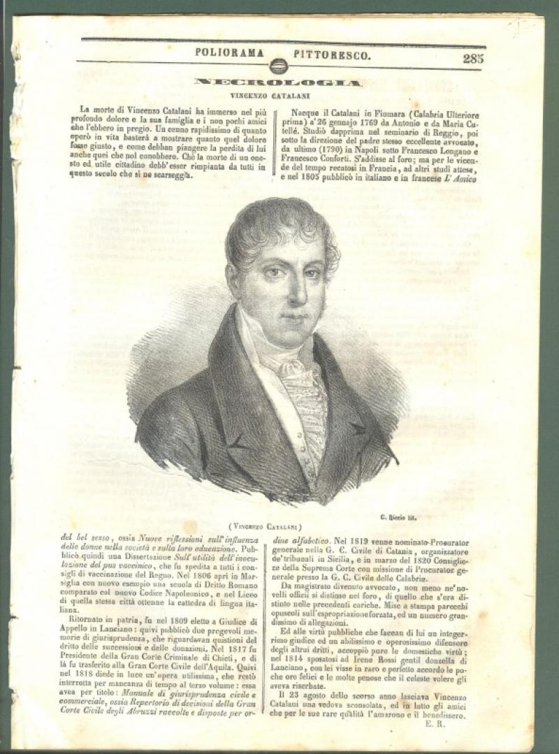 VINCENZO CATALANI di Fiumera in Calabria. Fascicolo intero di pagine 8 del Poliorama Pittoresco del 12 Aprile 1844 contenente necrologia e ritratto inciso in litografia da Gaetano Riccio. Piccoli difetti. (Rif.D4672)