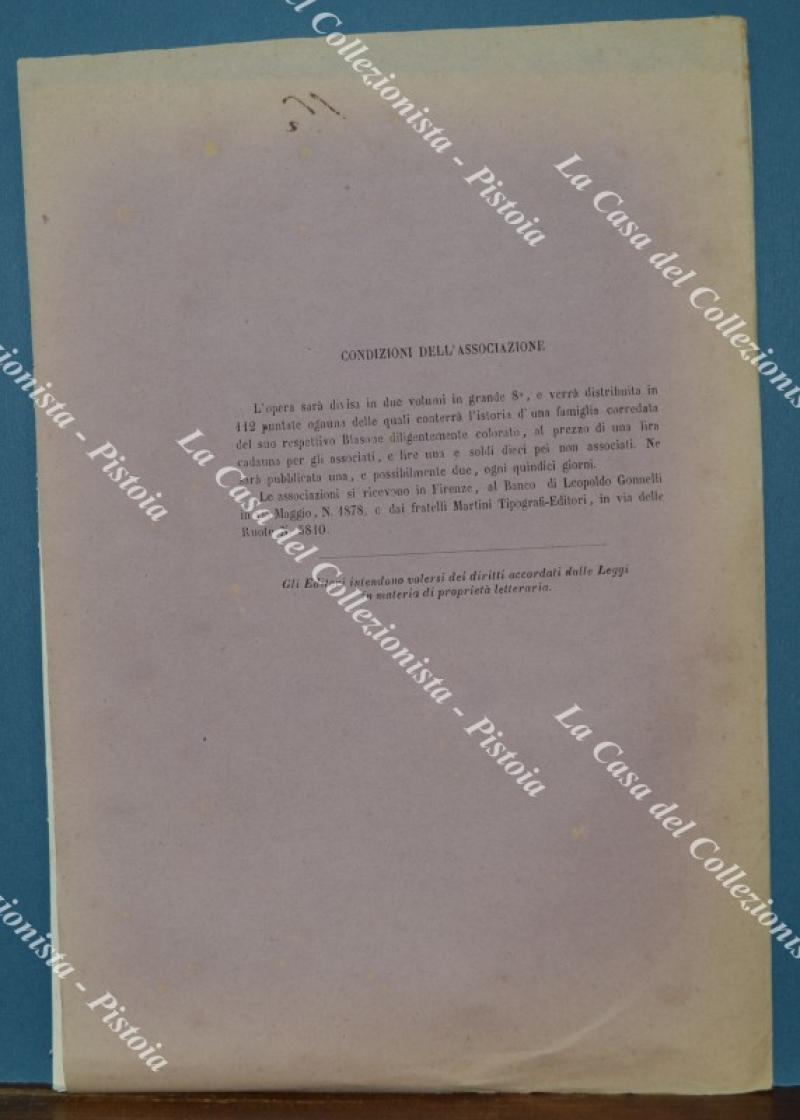 (Araldica - Toscana) Famiglia ACCOLTI d'AREZZO. Fascicolo completo di cm 19,5x28,5: brossura editoriale contenente tavola colorata all'epoca a mano e 3 pagine di testo relative alla storia della famiglia. Il fascicolo è tratto dall'opera SOMMARIO STORICO DELLE FAMIGLIE CELEBRI TOSCANE di Tiribilli Giuliani - Luigi Passerini edita tra il 1862 ed il 1865 a Firenze da Alessandro Diligenti. Buona conservazione. (Rif.F7581)
