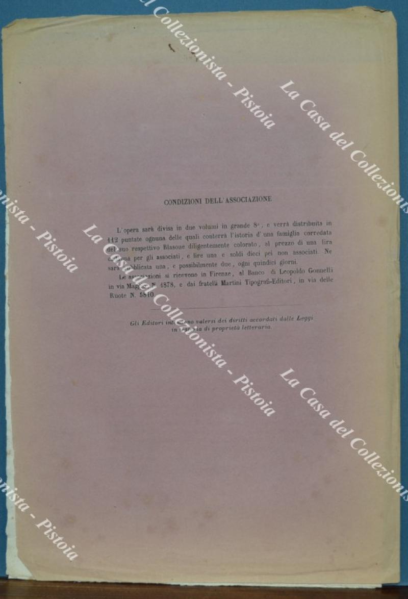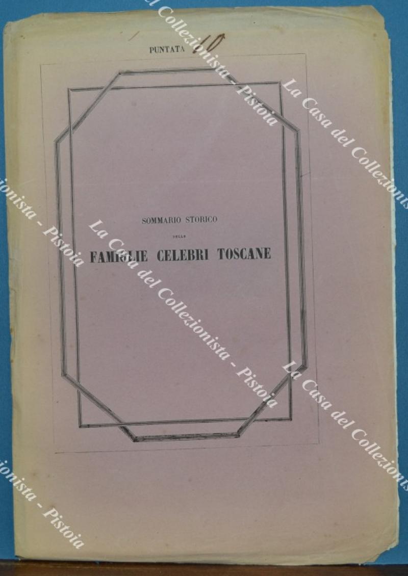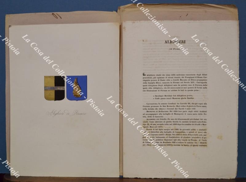 (Araldica - Toscana) Famiglia ALIGHIERI di FIRENZE. Fascicolo completo di cm 19,5x28,5: brossura editoriale contenente tavola colorata all'epoca a mano e 4 pagine di testo relative alla storia della famiglia. Il fascicolo è tratto dall'opera SOMMARIO STORICO DELLE FAMIGLIE CELEBRI TOSCANE di Tiribilli Giuliani - Luigi Passerini edita tra il 1862 ed il 1865 a Firenze da Alessandro Diligenti. Buona conservazione. (Rif.F7579)
