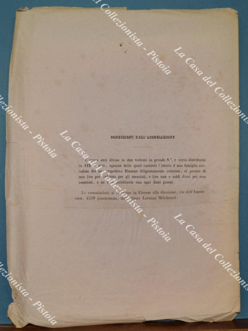 (Araldica - Toscana) Famiglia BONAPARTE di FIRENZE. Fascicolo completo di cm 19,5x28,5: brossura editoriale contenente tavola colorata all'epoca a mano e 4 pagine di testo relative alla storia della famiglia. Il fascicolo è tratto dall'opera SOMMARIO STORICO DELLE FAMIGLIE CELEBRI TOSCANE di Tiribilli Giuliani - Luigi Passerini edita tra il 1862 ed il 1865 a Firenze da Alessandro Diligenti. Buona conservazione, piccoli difetti alla brossura editoriale. (Rif.F7574)