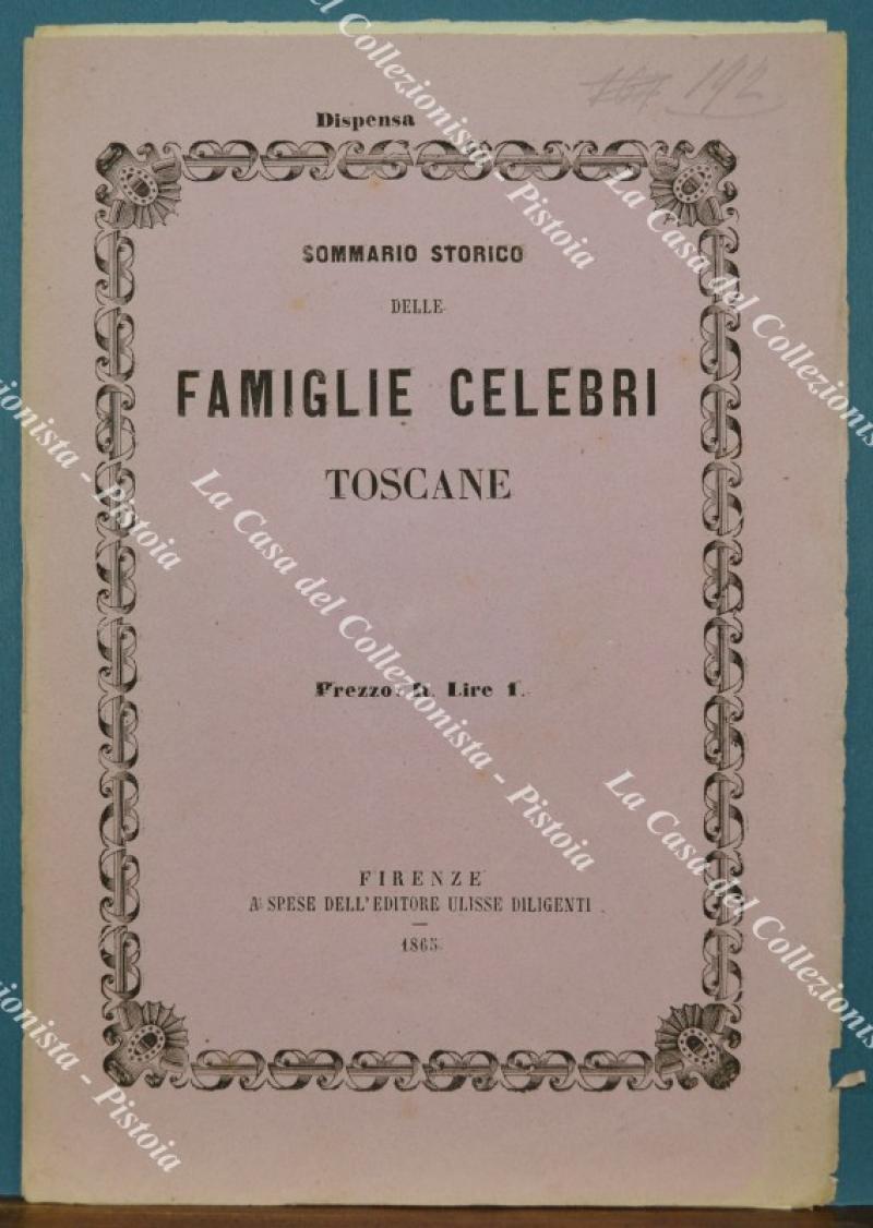 (Araldica - Toscana) Famiglia GAMBARINI di LUCCA. Fascicolo completo di cm 19,5x28,5: brossura editoriale contenente tavola colorata all'epoca a mano e 4 pagine di testo relative alla storia della famiglia. Il fascicolo è tratto dall'opera SOMMARIO STORICO DELLE FAMIGLIE CELEBRI TOSCANE di Tiribilli Giuliani - Luigi Passerini edita tra il 1862 ed il 1865 a Firenze da Alessandro Diligenti. Buona conservazione. (Rif.F7566)