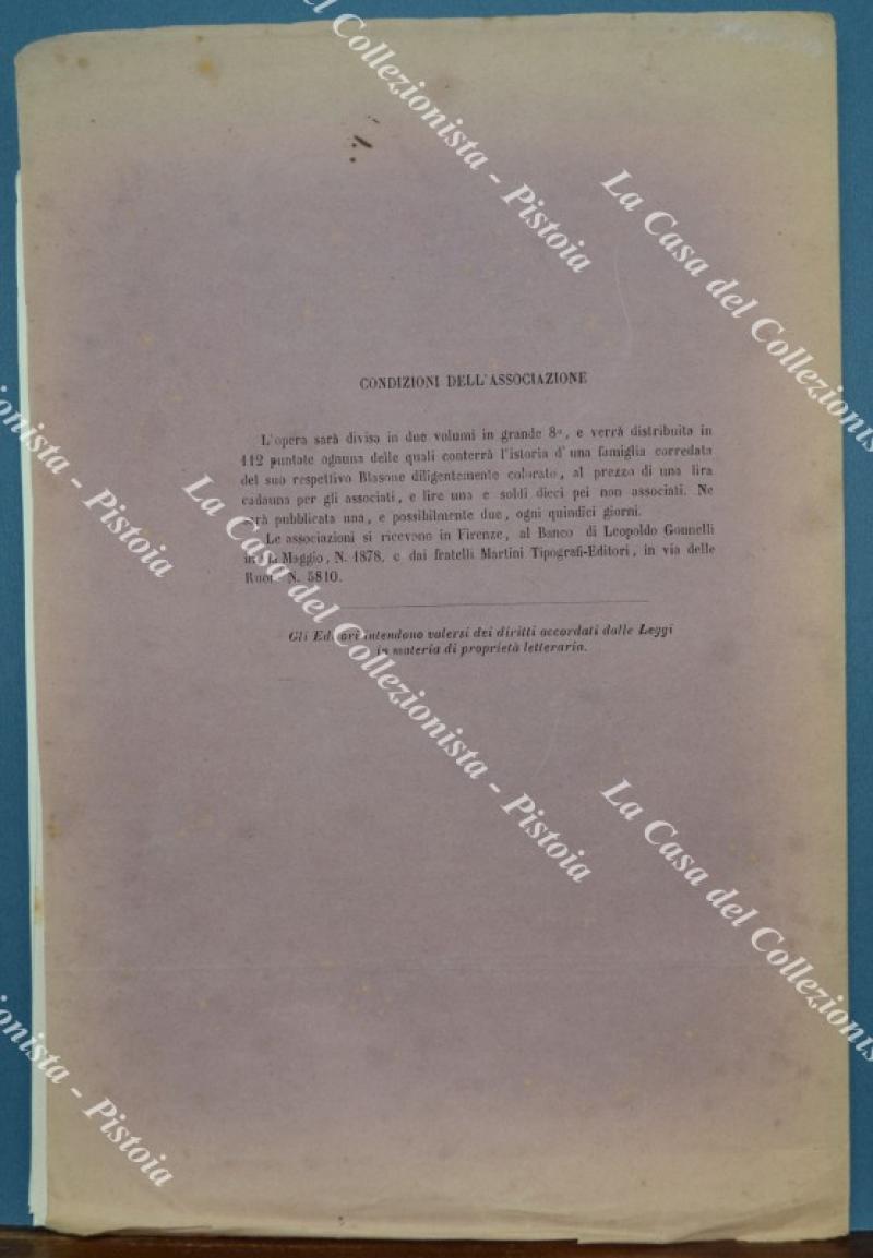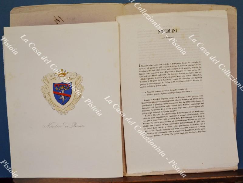 (Araldica - Toscana) Famiglia NICCOLINI di FIRENZE. Fascicolo completo di cm 19,5x28,5: brossura editoriale contenente tavola colorata all'epoca a mano e 4 pagine di testo relative alla storia della famiglia. Il fascicolo è tratto dall'opera SOMMARIO STORICO DELLE FAMIGLIE CELEBRI TOSCANE di Tiribilli Giuliani - Luigi Passerini edita tra il 1862 ed il 1865 a Firenze da Alessandro Diligenti. Buona conservazione. (Rif.F7572)