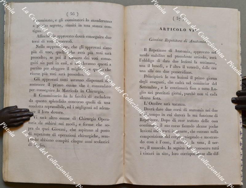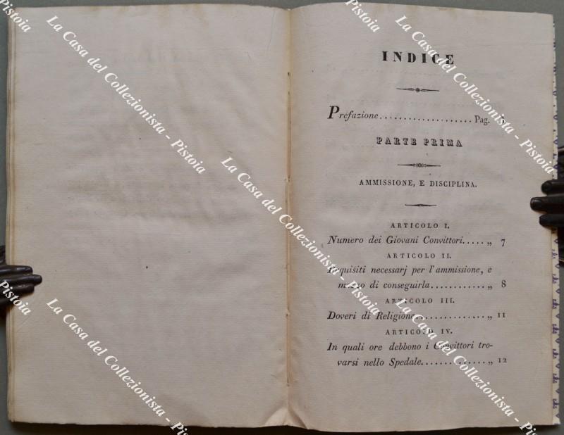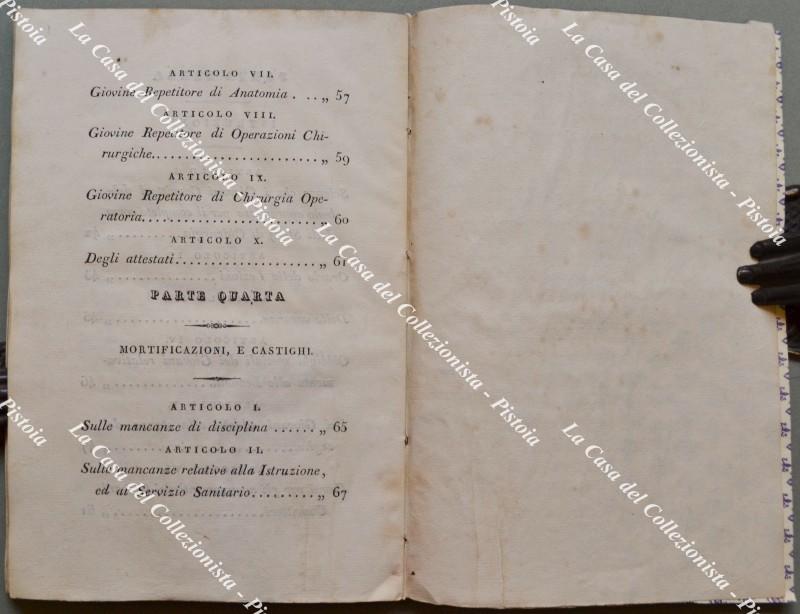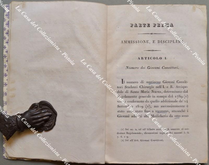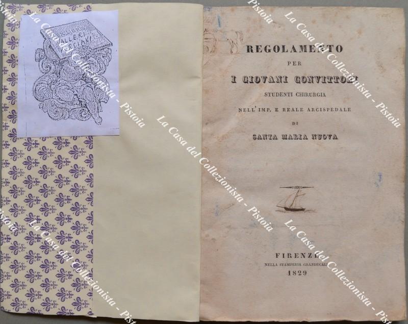(Toscana - Chirurgia) REGOLAMENTO PER I GIOVANI CONVITTORI STUDENTI CHIRURGIA NELL.'IMP E REALE ARCISPEDALE DI SANTA MARIA NUOVA. Firenze, Stamp. Granducale, 1829. Cm 13x20, brossura recente, pp. 70 + (10). Regole per l'ammissione, servizio interno, istruzione, castighi. Frontespizio un poco sporco, piccoli segni d'uso. (Rif.F5988-76)