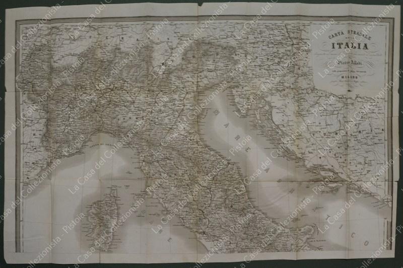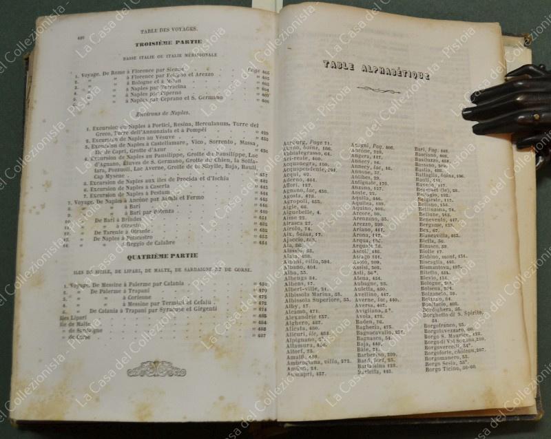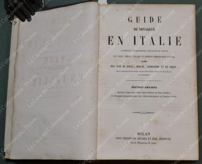 (Italia - guida). GUIDA DU VOYAGER EN ITALIE. Contenant la description detaillee de toutes les villes, bourgs, villages et endroits remarquables d'Italie, celle des iles de Sicilie, Malte, Sardaigne et de Corse. Edition Artaria enrichie d'une tres - belle Carte d'Italie en deux feuilles, de 16 plans topographiques des villes principales et d'autre cartes. Milano, circa 1850. In 16° (cm 12x19) tela editoriale. Pagine XXXV + 498. Mancano alcune carte fuori testo; sono presenti le 2 grandi carte dell'Italia , contenute in tasche aperte, le piante di Genova, Milano, Verona, Padova, Venezia, Parma, Firenze, Pisa, Siena, Foro Romano, Pompei, Palermo. Volume ancora solido, tela usurata, ingiallimenti. (Rif.F6754)