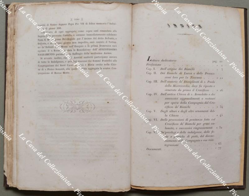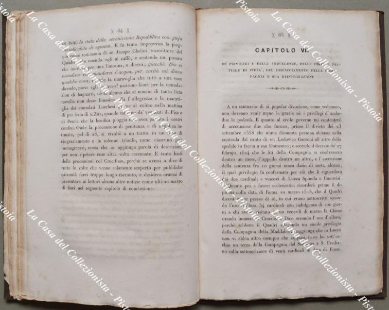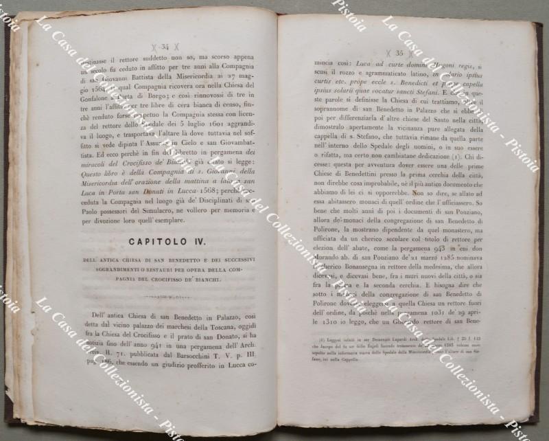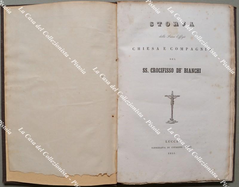 (Toscana - Lucca) BINI TELESFORO. STORIA DELLA SACRA EFFIGIE, CHIESA E COMPAGNIA DEL SS. CROCIFISSO DE' BIANCHI. Lucca, Giusti, 1855. Cm 15x23, tela recente (piatto anteriore della brossura originale applicto al contropiatto). Pp. IV + 100 + (2). Aloncini marginali. (Rif.F5951-76)