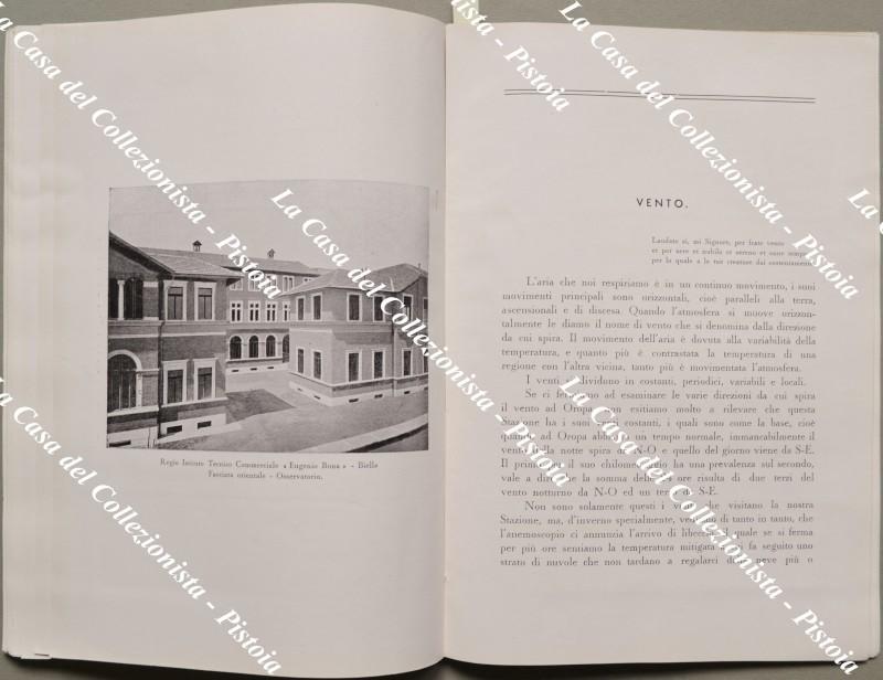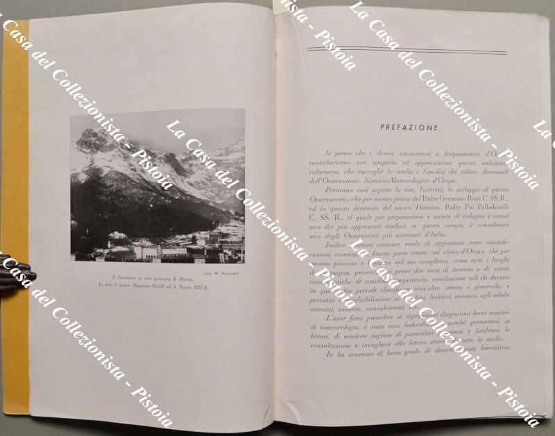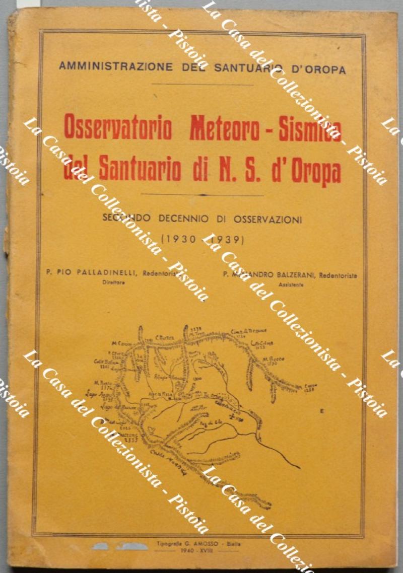 (Sismologia - Meteorologia - Piemonte) OSSERVATORIO METEORO - SISMICO DEL SANTUARIO DI N.S. D'OROPA. Secondo decennio di osservazioni (1930 - 1939). Biella, Tip. Amosso, 1940. Cm 17x24.5, brossura editoriale, pagine 137 + (7) con illustrazioni nel testo e tavole ripiegate con diagrammi. Le ultime pp. sono dedicate alla flora e fauna di Oropa. Minimi usure. (Rif.F5684-76)