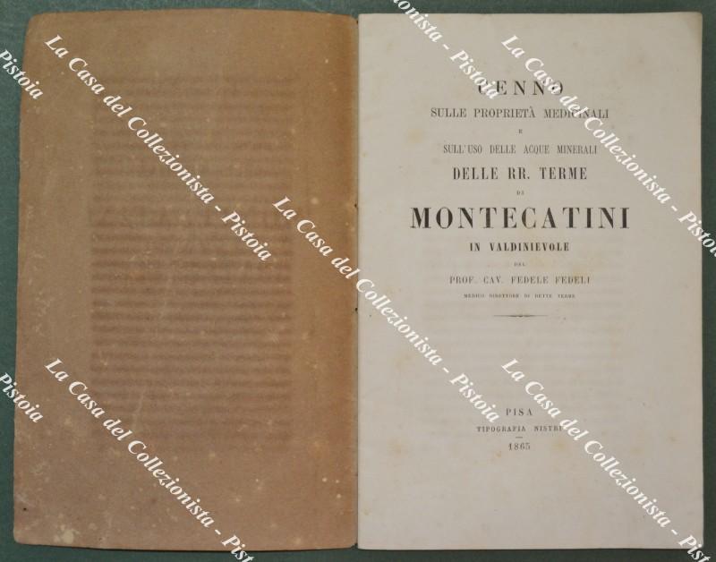 (Pistoia) FEDELI Fedele. CENNO SULLE PROPRIETA' MEDICINALI E SULL'USO DELLE ACQUE MINERALI DELLE RR. TERME DI MONTECATINI IN VALDINIEVOLE. Pisa, Tip. Nistrio, 1865. Cm 14x21, brossura editoriale, pagine 24. (Rif.F7285)