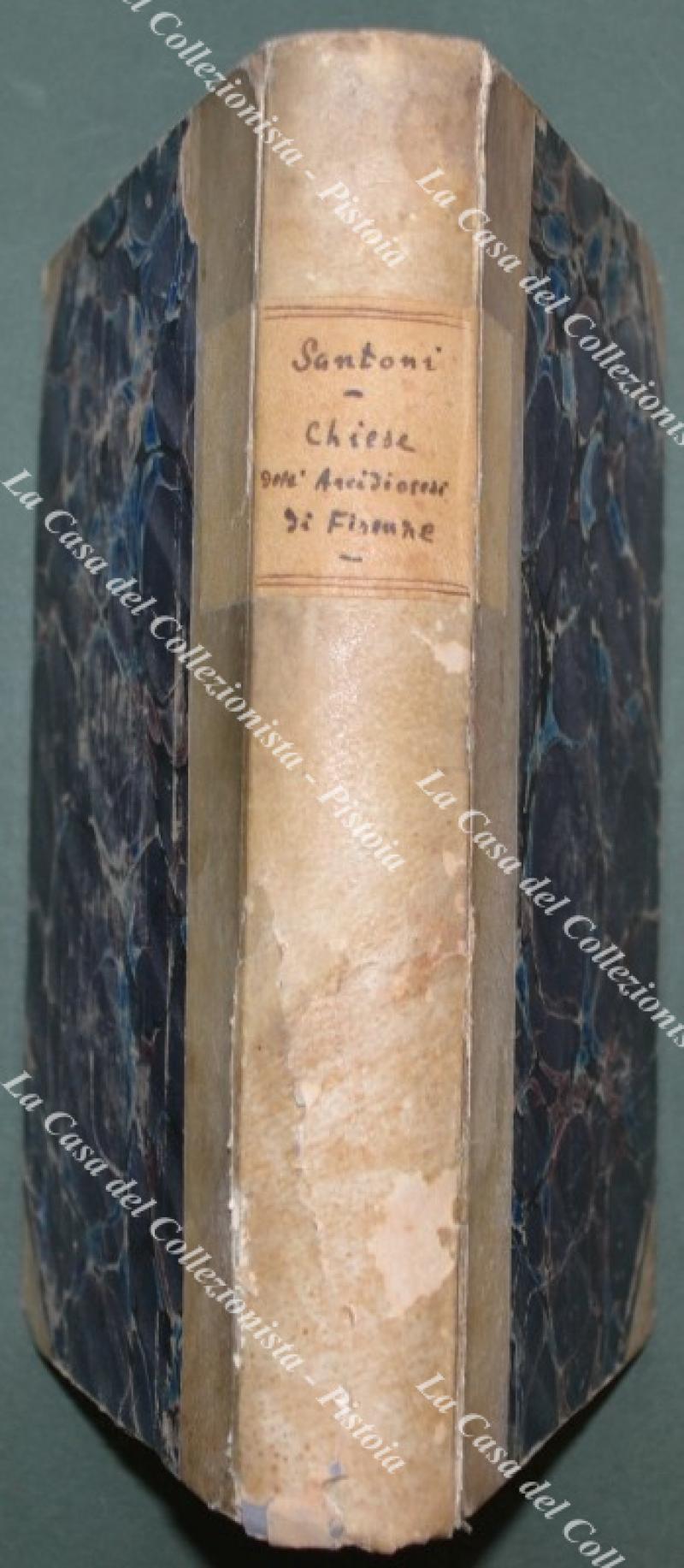 (Toscana, Firenze) SANTONI LUIGI. RACCOLTA DI NOTIZIE STORICHE RIGUARDANTI LE CHIESE DELL'ARCI-DIOCESI DI FIRENZE. Firenze, Tip. Mazzoni, 1847. Cm 14x21,5, mezza pergamena coeva, pp. 430. Qualche usura alla legatura (dorso con fessurazioni ai giochi con i piatti e piccole spellature) e all'interno qualche alone e fioritura. (Rif.F7797-77)
