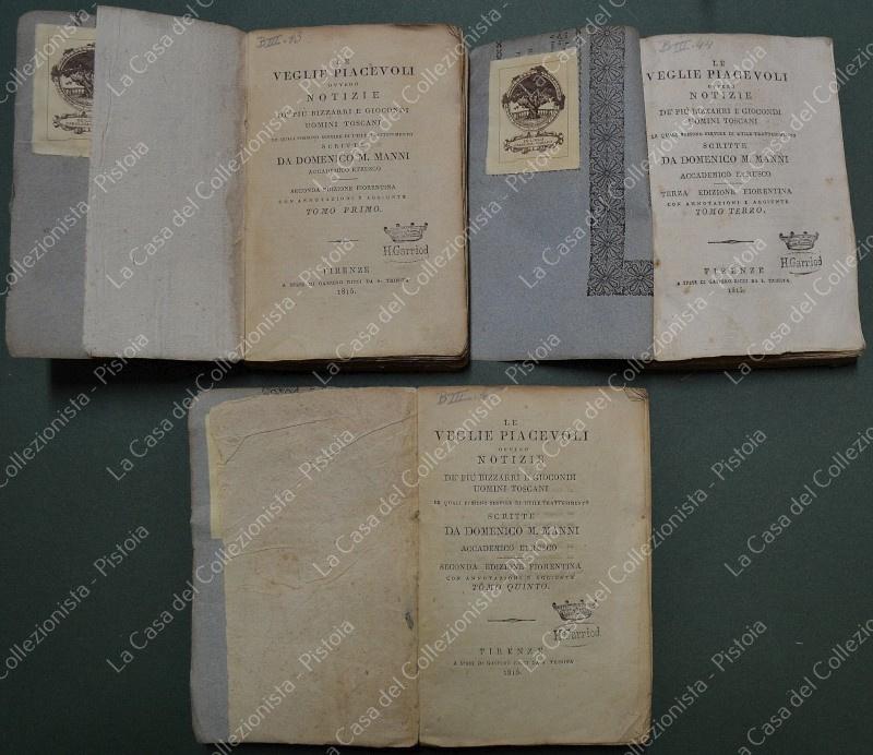 (Toscana - biografie). MANNI DOMENICO MARIA. LE VEGLIE PIACIEVOLI OVVERO NOTIZIE DE PIU' BIZZARRI E GIOCONDI UOMINI TOSCANI LE QUALI POSSONO SERVIRE DI UTILE TRATTENIMENTO. Seconda edizione fiorentina. Firenze, Gaspero Ricci, 1815 - 1816. Cm 11x17,3, brossure mute coeve. Disponiamo di 6 tomi su 8 (mancano il 7° e 8°) rilegati in 3 volumi: Pagine 136 + pagine 132 + pagine 144 + pagine 97 + pagine 138 + pagine 131 + (1). Conservazione buona eccetto deboli ingiallimenti, esemplare non rifatto. (Rif.F6755)