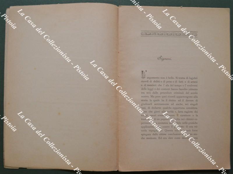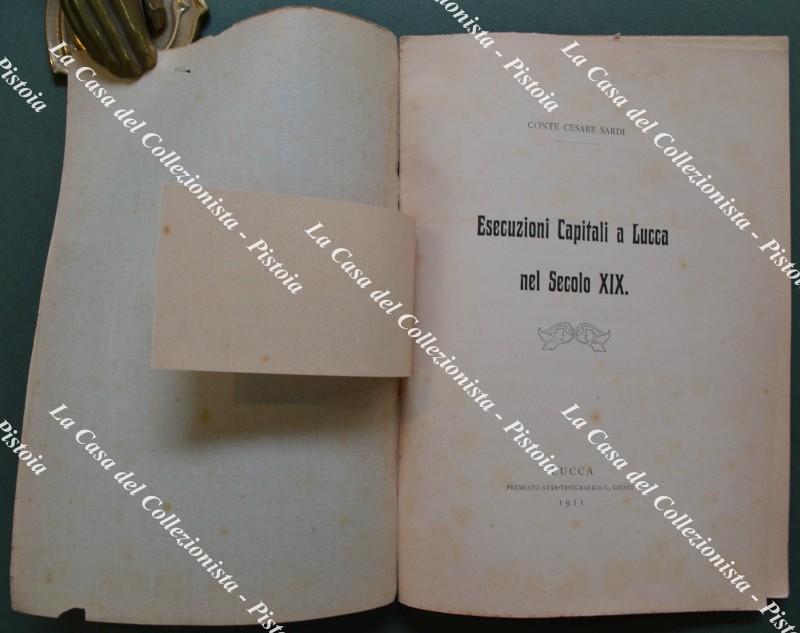 (Toscana - esecuzioni di morte) SARDI Cesare. ESECUZIONI CAPITALI A LUCCA NEL SECOLO XIX. Studio di documenti e ricordi letto alla R. Accademia Lucchese il 22 maggio 1911. Lucca, Tip. Giusti, 1911. Cm 17x24, brossura originale (dorso guasto e ingiallimenti), pp. 71. (Rif.F7230)