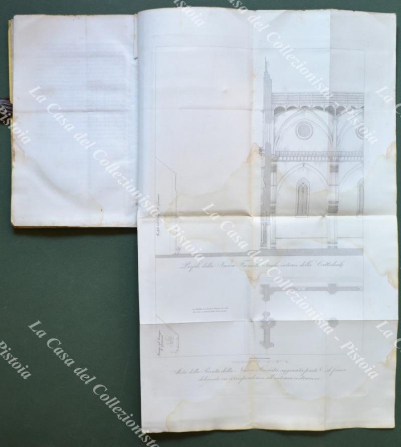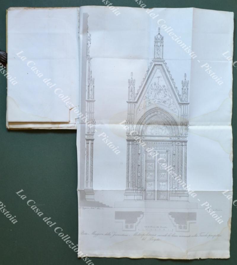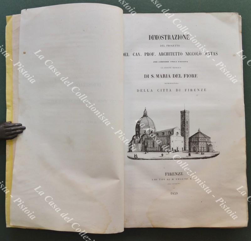 (Toscana - Firenze). MATAS NICCOLO'. DIMOSTRAZIONE DEL PROGETTO DEL CAV. PROF. ARCHITETTO NICCOLO' MATAS per compiere colla facciata la insigne basilica DI S. MARIA DEL FIORE metropolitana DELLA CITTA' DI FIRENZE. Firenze, Tip. Cellini, 1859. Formato cm 17.5x27.5, senza brossura, pagine 96 + (2) con 4 grandi tavole ripiegate alla fine fuori testo incise da L. Lasinio (3) e J. Verkruys. Un leggero alone all'angolo inferiore destro delle pagine e tavole. (Rif.F3832)