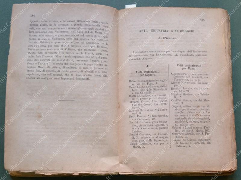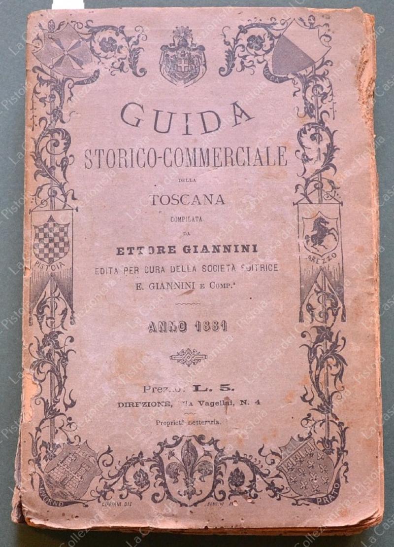 TOSCANA anno 1881. Guida Storico - Commerciale della Toscana. Compilata da Ettore Giannini. Anno 1881. Formato cm 12,5x19, brossura editoriale tipografica. Pagine 446 + alcune pubblicitarie. La prima parte è dedicata a Firenze, la seconda al resto della Toscana. Per ogni località, in ordine alfabetico, sono indicate varie attività artigianali e commerciali. Sono presenti vistose rosicchiature che interessano per lo più il margine bianco laterale. Rara. (Rif.F6786)