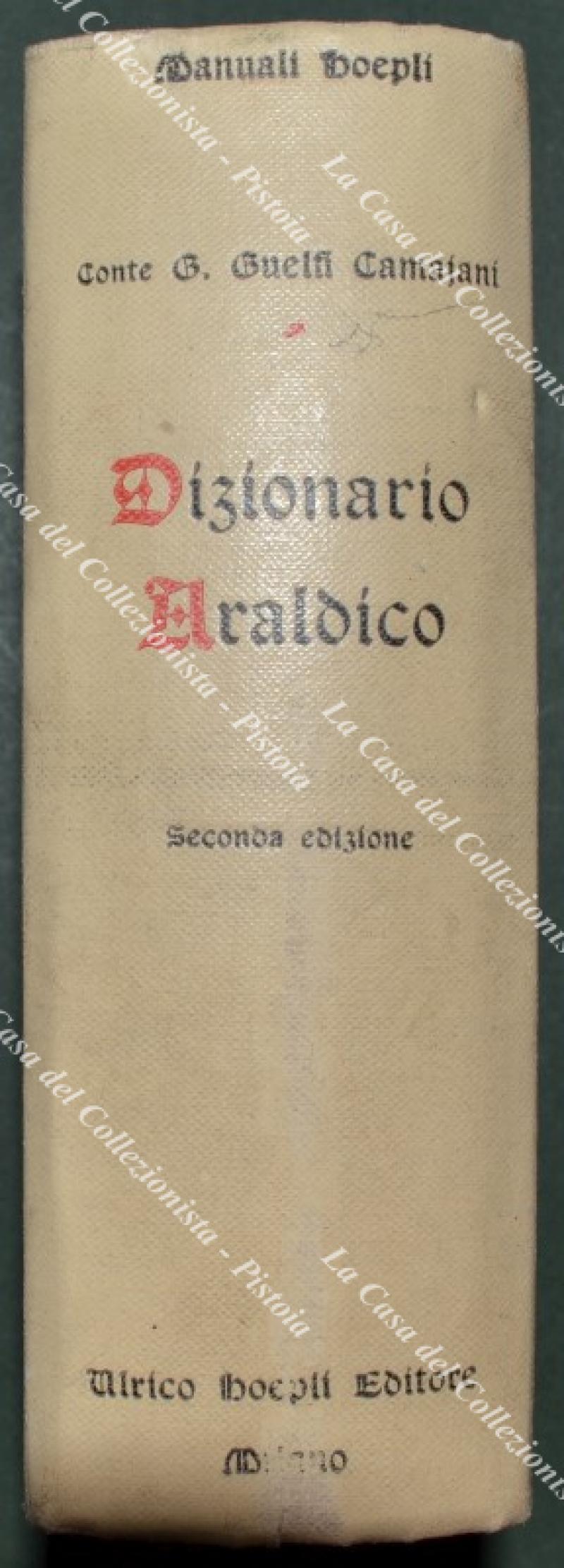 (Manuali Hoepli) GUELFI CAMAJANI. DIZIONARIO ARALDICO. Milano, Hoepli, 1921. In 16° (cm 10,5x15), tela editoriale illustrata, pp. 816 + (2) con 569 figure nel testo e 2 tavole a colori fuori testo. Conservazione ottima eccetto macchietta al piatto anteriore. (Rif.F7798)