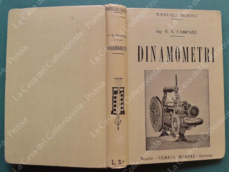 Manuale Hoepli. CAMPAZZI E. N.. DINAMOMETRI. Apparecchi per le misure delle forze e del lavoro da questi eseguito mentre agiscono lungo determine traiettorie. Mialno, Hoepli, 1907. In 16°, tela editoriale illustrata, pagine XX + 273 con 132 incisioni nel testo. Ottima conservazione. (Rif.F8048)