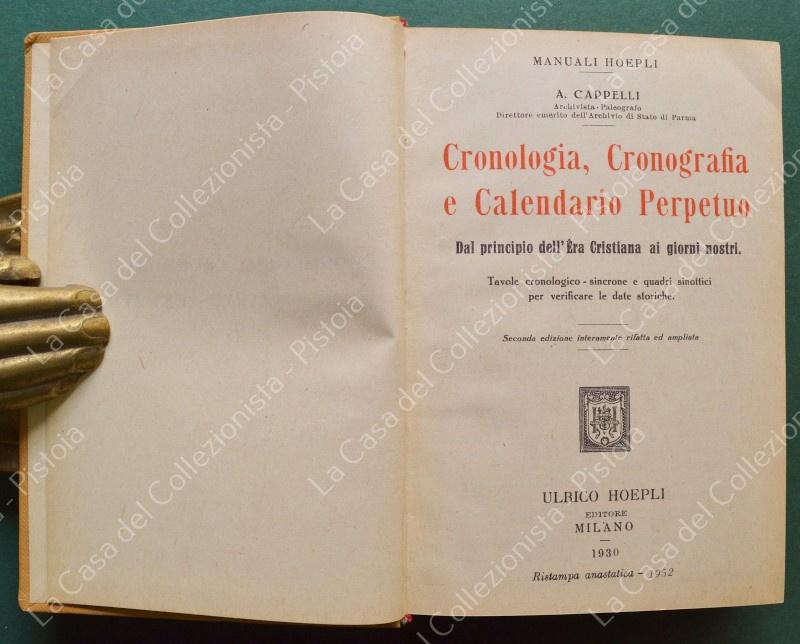 Manuale Hoepli. CAPPELLI A.. CRONOLOGIA, CRONOGRAFIA E CALENDARIO PERPETUO. Dal principio dell'Era Cristiana ai giorni nostri. Tavole cronologico - sincrone e quadri sinottici per verificare le date storiche. Seconda edizione interamente rifatta ed ampliata. Milano, Hoepli, 1930. In 16°, tela editoriale illustrata, pagine XI + 566. Buona conservazione. (Rif.F8049)