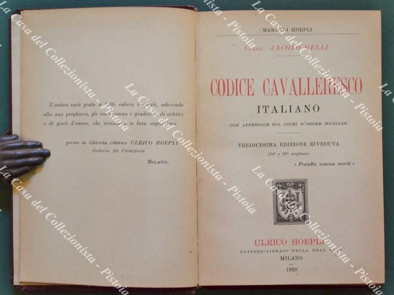 (Manuale Hoepli) GELLI JACOPO. CODICE CAVALLERESCO ITALIANO. Con appendice del giurì d’onore militare. Milano, Hoepli, 1920.