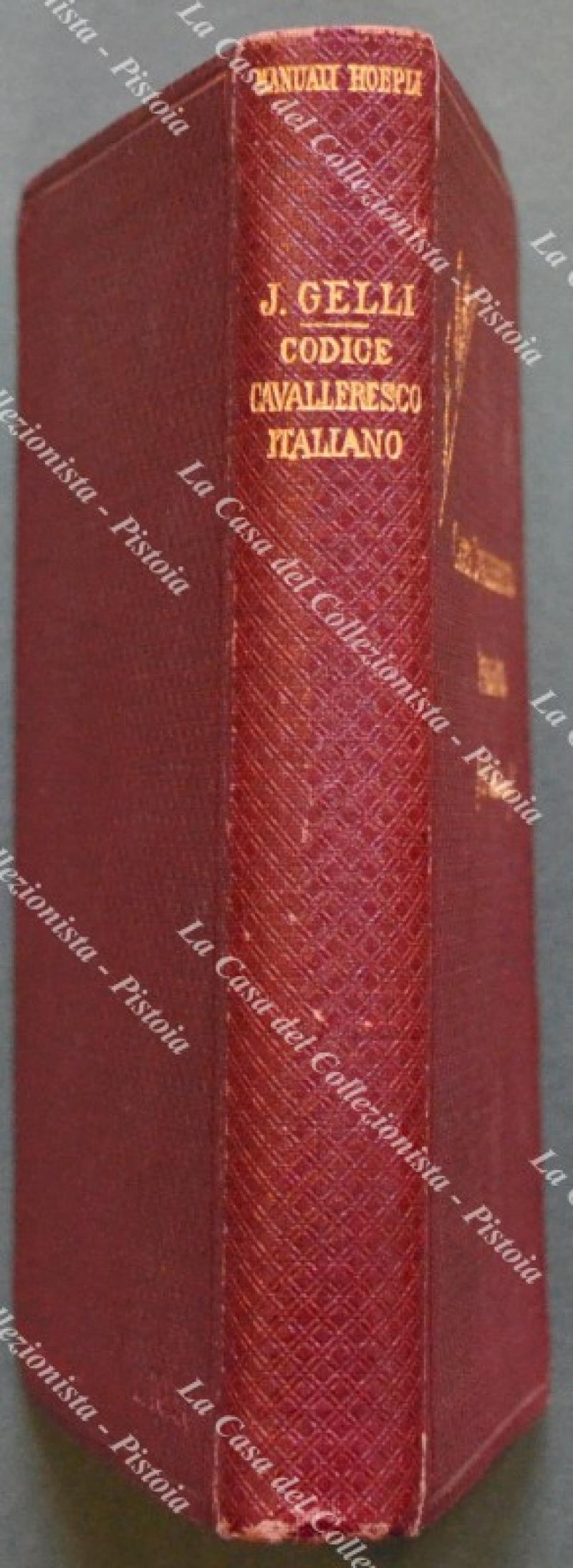 (Manuale Hoepli) GELLI JACOPO. CODICE CAVALLERESCO ITALIANO. Con appendice del giurì d’onore militare. Tredicesima edizione riveduta. Milano, Hoepli, 1920. In 16° (cm10,5x15), tela editoriale con titolo in oro al piatto, pp. XXIV + 318. Ottima conservazione. (Rif.F3225-718/75)