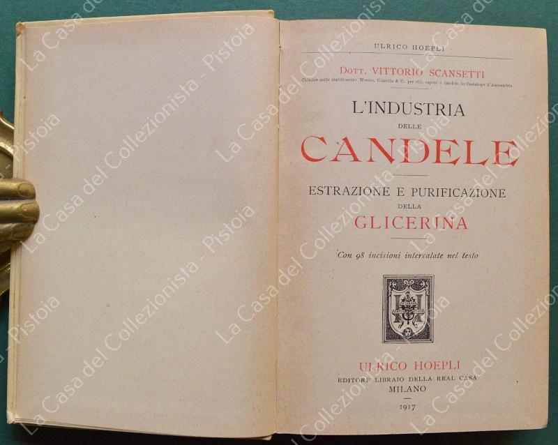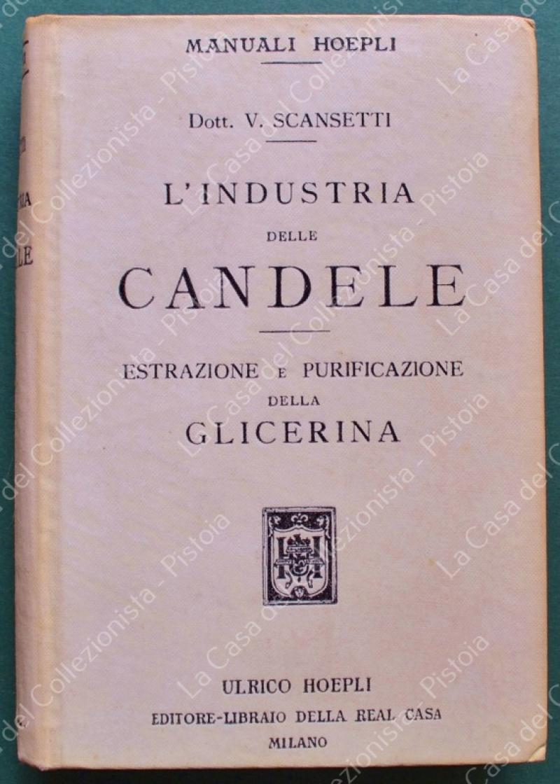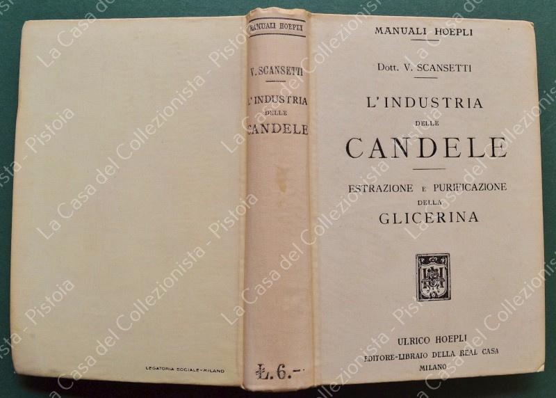 Manuale Hoepli. SCANSETTI VITTORIO. L'INDUSTRIA DELLE CANDELE. Estrazione e purificazione della glicerina. Milano, Hoepli, 1917. In 16°. tela editoriale illustrata, pagine XX + 401 con 98 incisioni nel testo. Ottima conservazione. (Rif.F8050)
