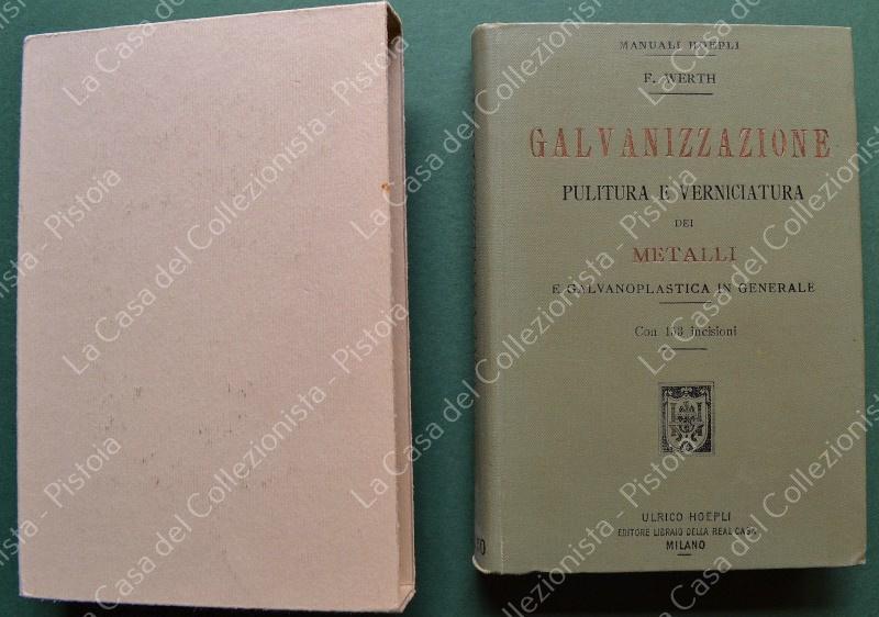 Manuale Hoepli. WERTH FEDERICO. GALVANIZZAZIONE. PULITURA E VERNICIATURA DEI METALLI E GALVANOPLASTICA IN GENERALE. Manuale pratico per l'Industria e l'Operaio. Milano, Hoepli, 1900. In 16° tela editoriale illustrata con custodia; pagine XVI + 323 con 153 incisione nel testo. Perfetta conservazione. (Rif.F8056)