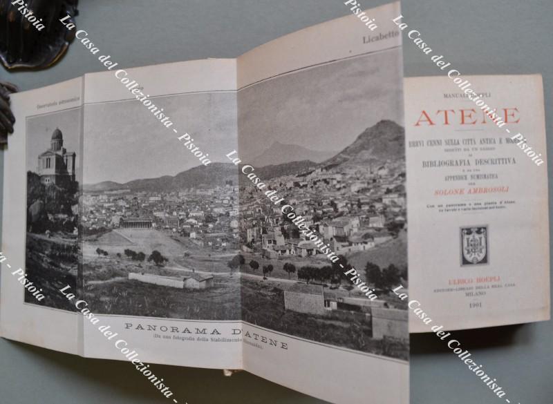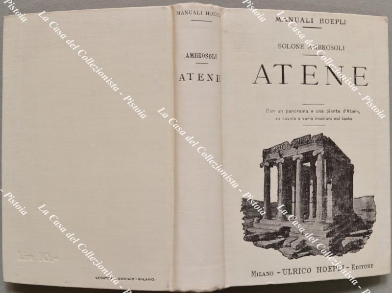 (Manuali Hoepli) AMBROSOLI S.. ATENE. Brevi cenni sulla città antica e moderna. Seguiti da un saggio di bibliografia descrittiva e da una appendice numismatica. Con un panorama e una pianta d'Atene, 22 tavole e varie incisioni nel testo. Milano, Hoepli, 1901. Cm 10.5x15, tela editoriale illustrata, pp. 170. Conservazione assai buona eccetto alone marginale alle tavole finali. (Rif.F6189-76)