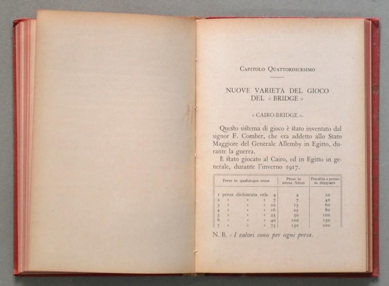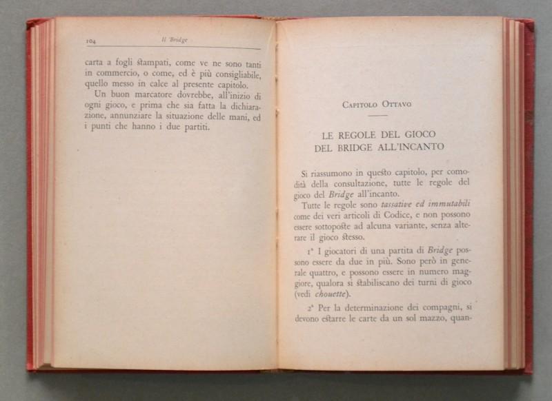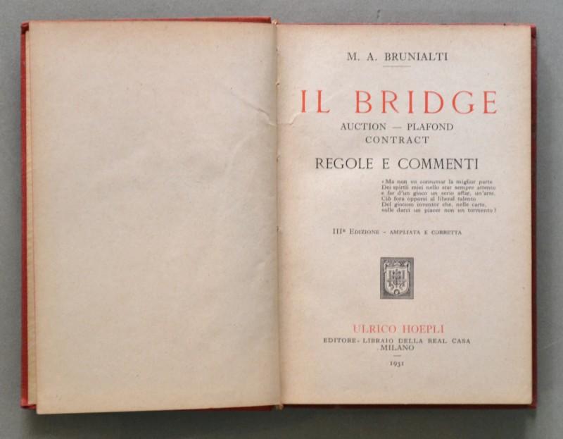 (Manuali Hoepli) BRUNIALTI M.A.. IL BRIDGE. AUCTION, PLAFOND, CONTRACT. Terza edizione ampliata e corretta. Milano, Hoepli, 1931, in 16°, tela editoriale, pp. XVI + 327. Interno ottimo, piccoli segni d’uso alla tela e segni di adesivo ai contropiatti interni. (Rif.D4280 - 420/68)