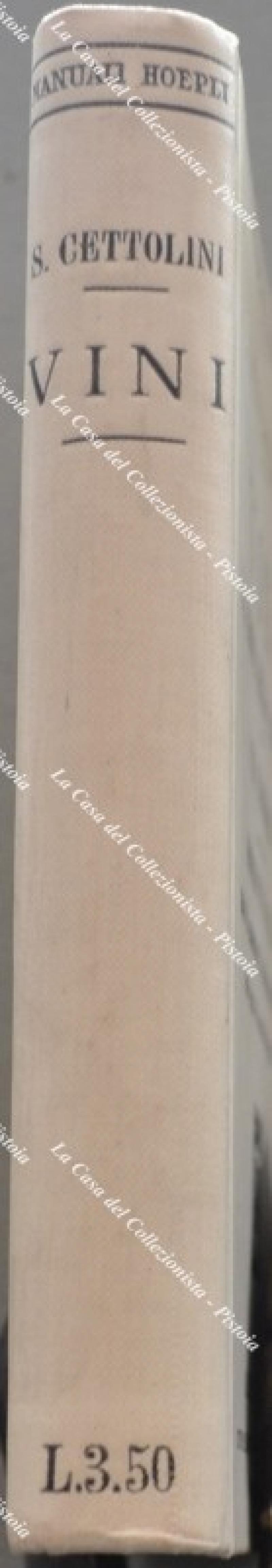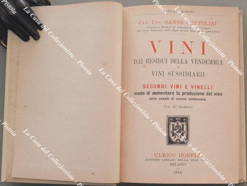 Manuali Hoepli. CETTOLINI SANTE. VINI DAI RESIDUI DELLA VENDEMMIA E VINI SUSSIDIARI. Secondi vini e vinelli. Modo di aumentare la produzione del vino nelle annate di scarsa vendemmia. Milano, Hoepli, 1916. In 16°, tela editoriale, pagine XVI con incisioni. Conservazione veramente ottima. (Rif.F6260 - 76)