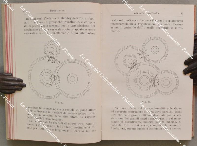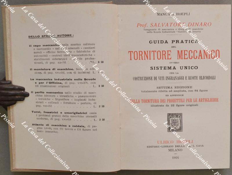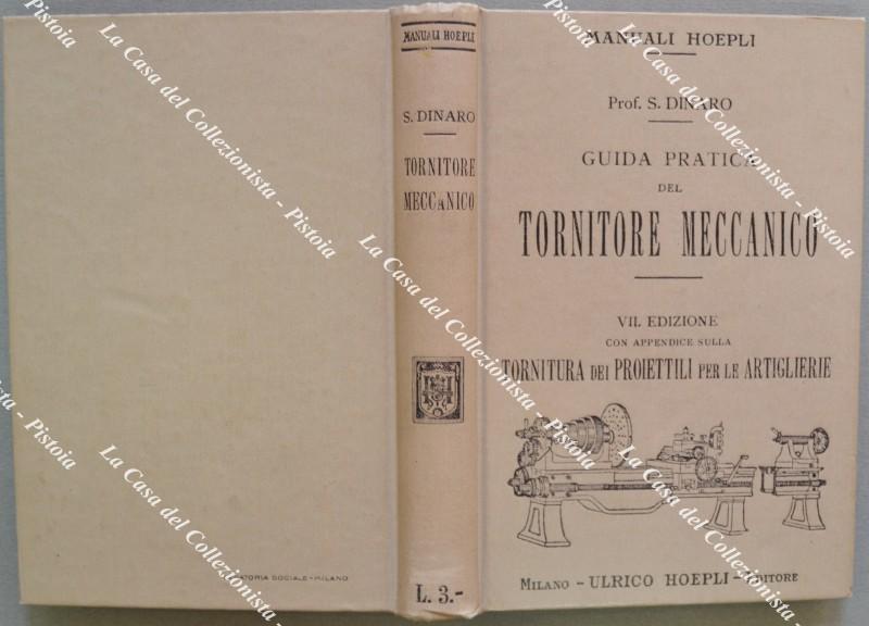 (Manuali Hoepli) DINARO S.. GUIDA PRATICA DEL TORNITORE MECCANICO ovvero sistema unico per la costruzione di viti ingranaggi e ruote elicoidali. Settima edizione totalmente rifatta con 84 figure ed appendice sulla tornitura dei proiettili per le artiglierie illustrata da 32 figure originali. Milano, Hoepli, 1916. Cm 10.5x15, tela editoriale illustrata, pp. XII + 294. Ottima conservaz.. (Rif.F6172-76)
